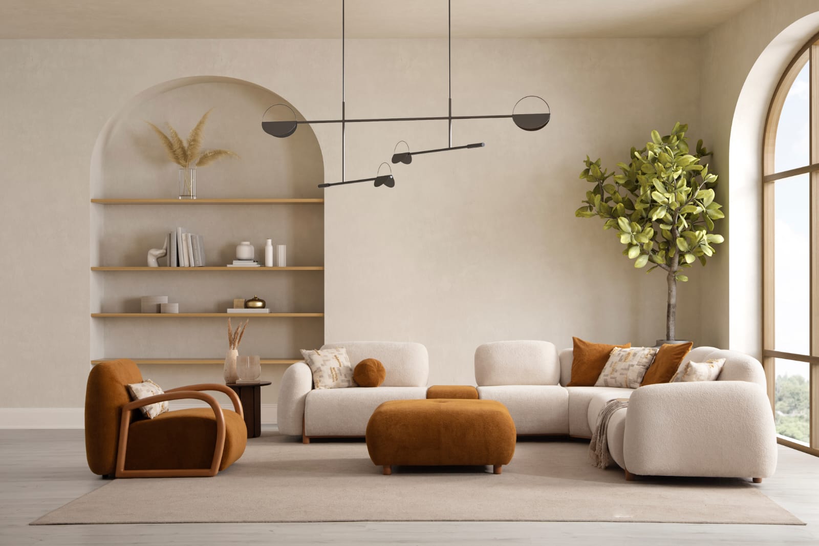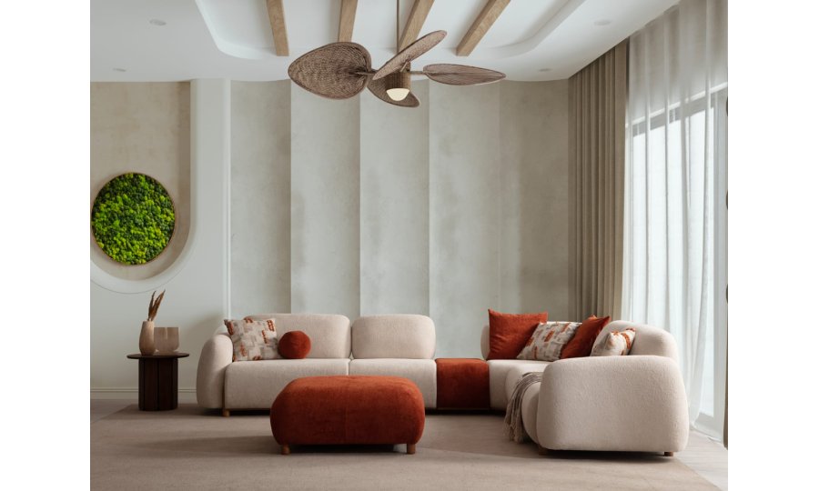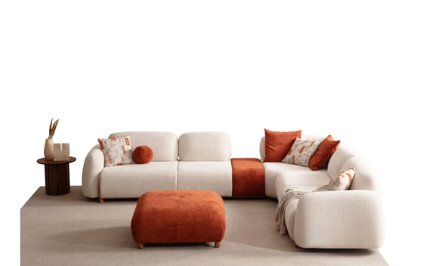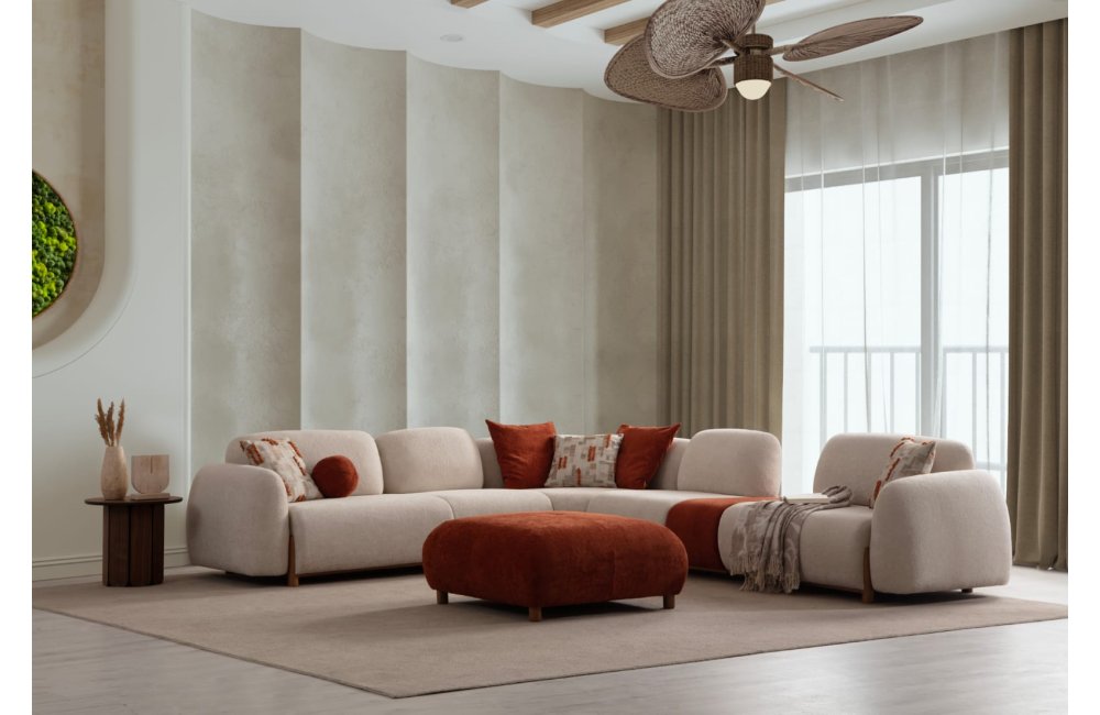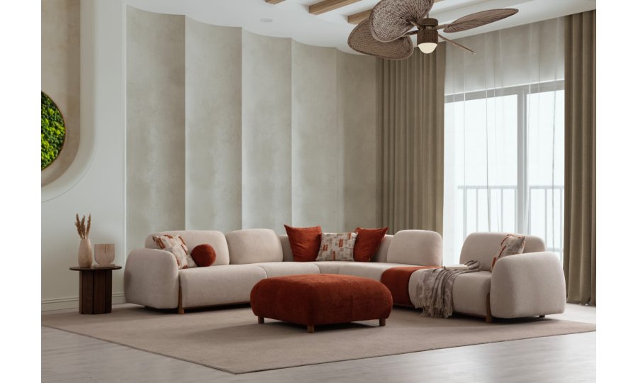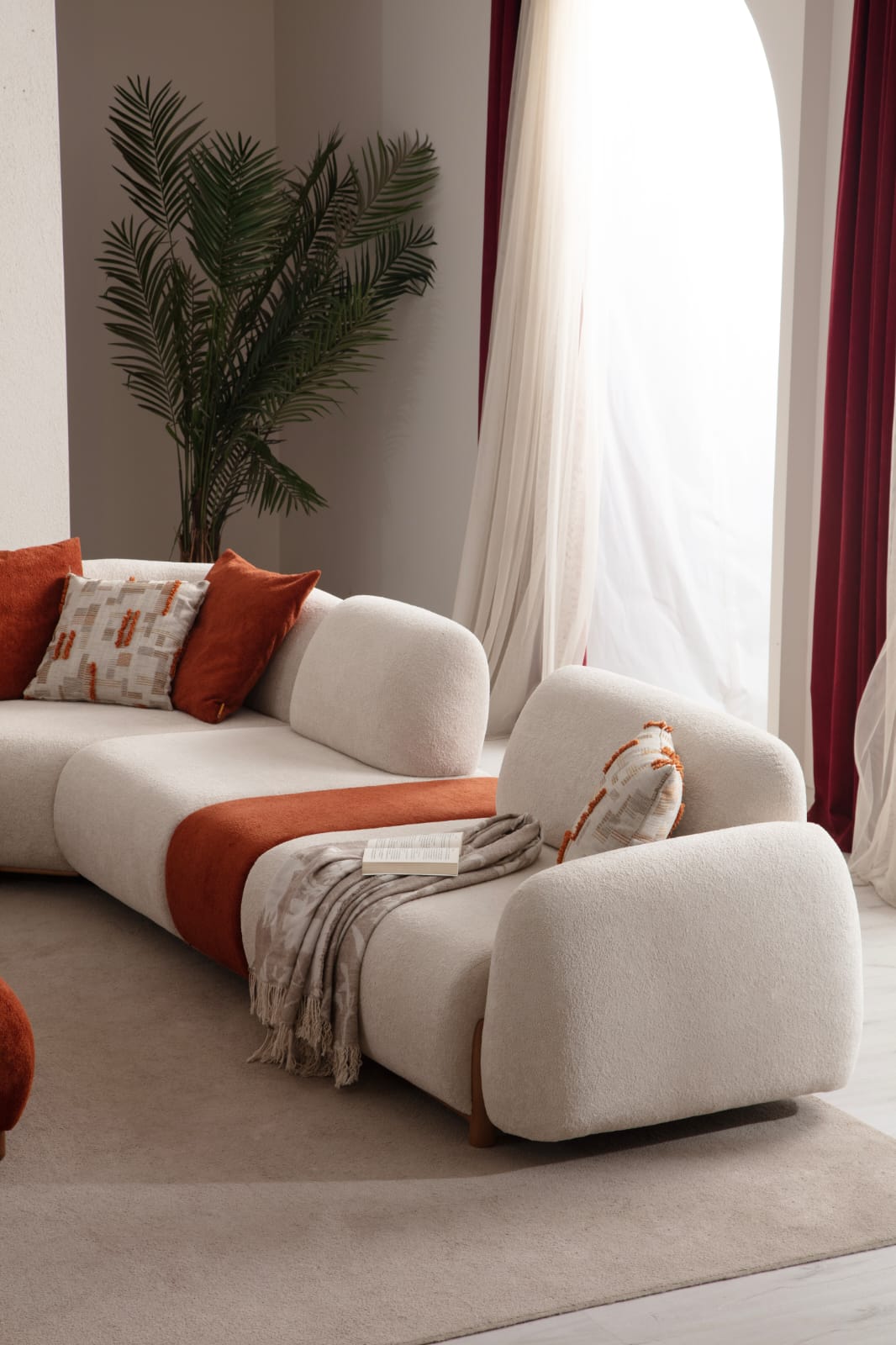 • Kontrast Renk Uyumu: Krem renginin dinginliği, kiremit rengi puf ve kırlent detaylarıyla dengelenerek mekanınıza dinamizm kazandırıyor.