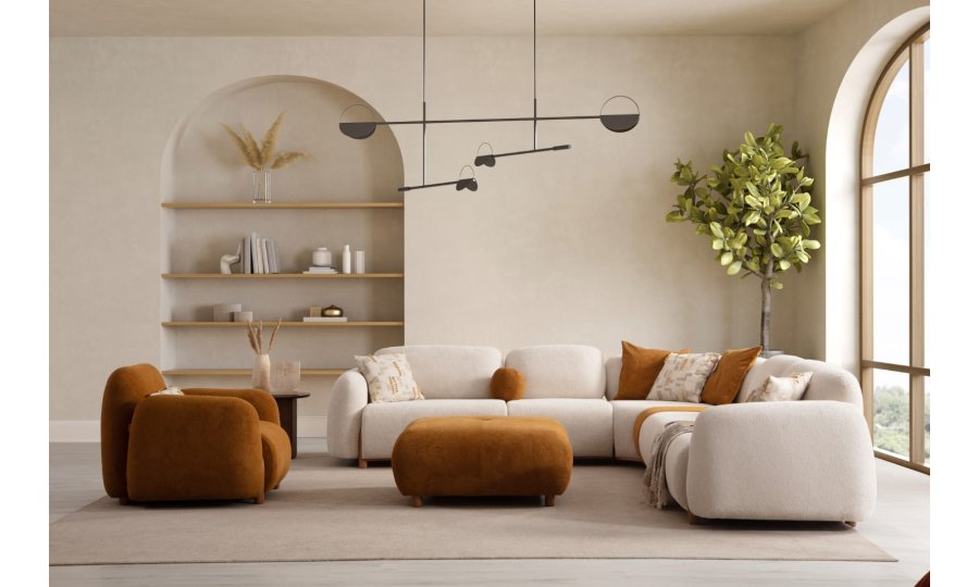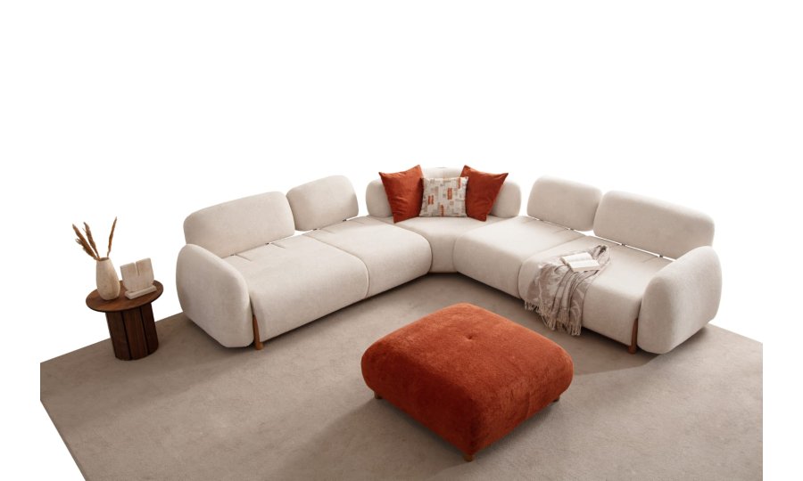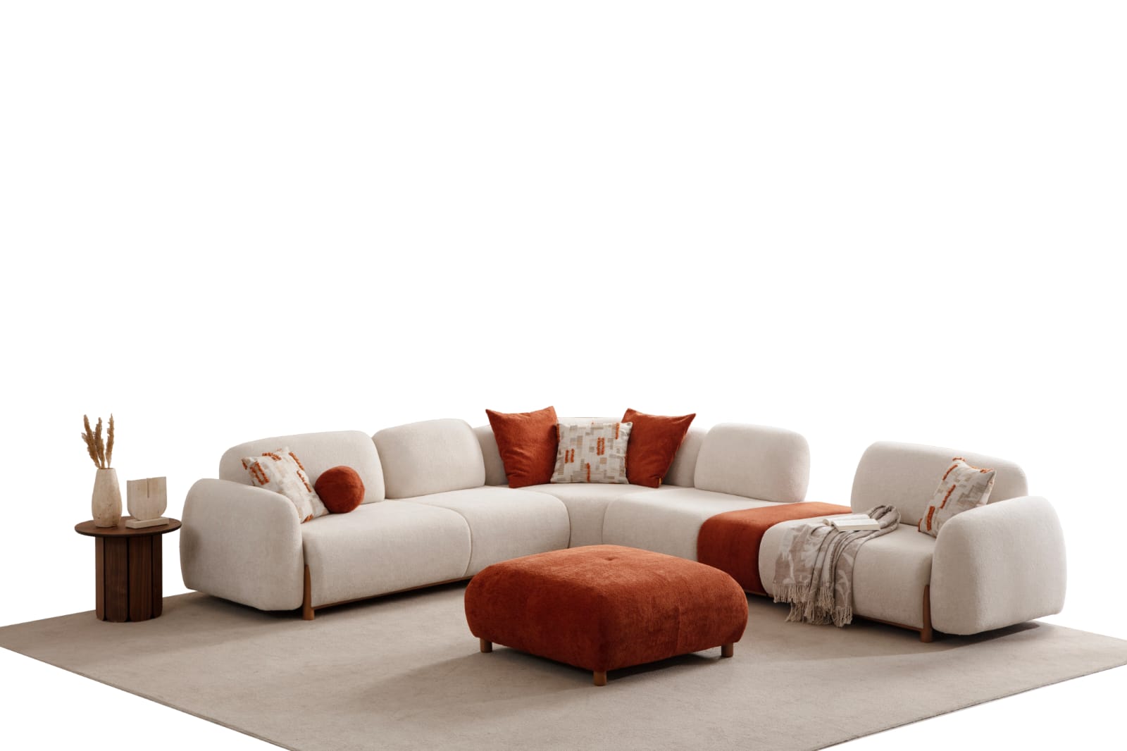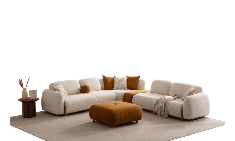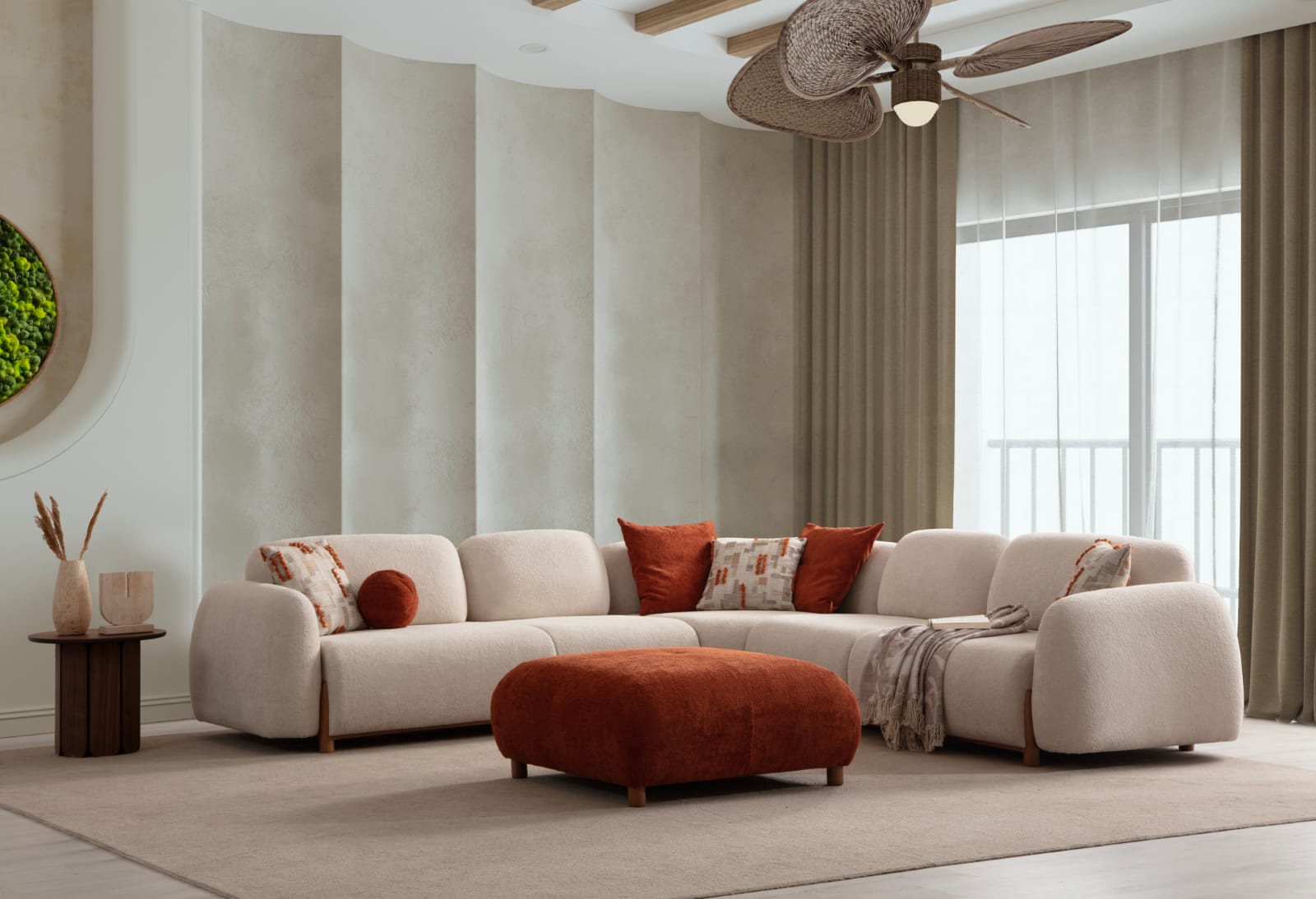 • Kontrast Renk Uyumu: Krem renginin dinginliği, kiremit rengi puf ve kırlent detaylarıyla dengelenerek mekanınıza dinamizm kazandırıyor.