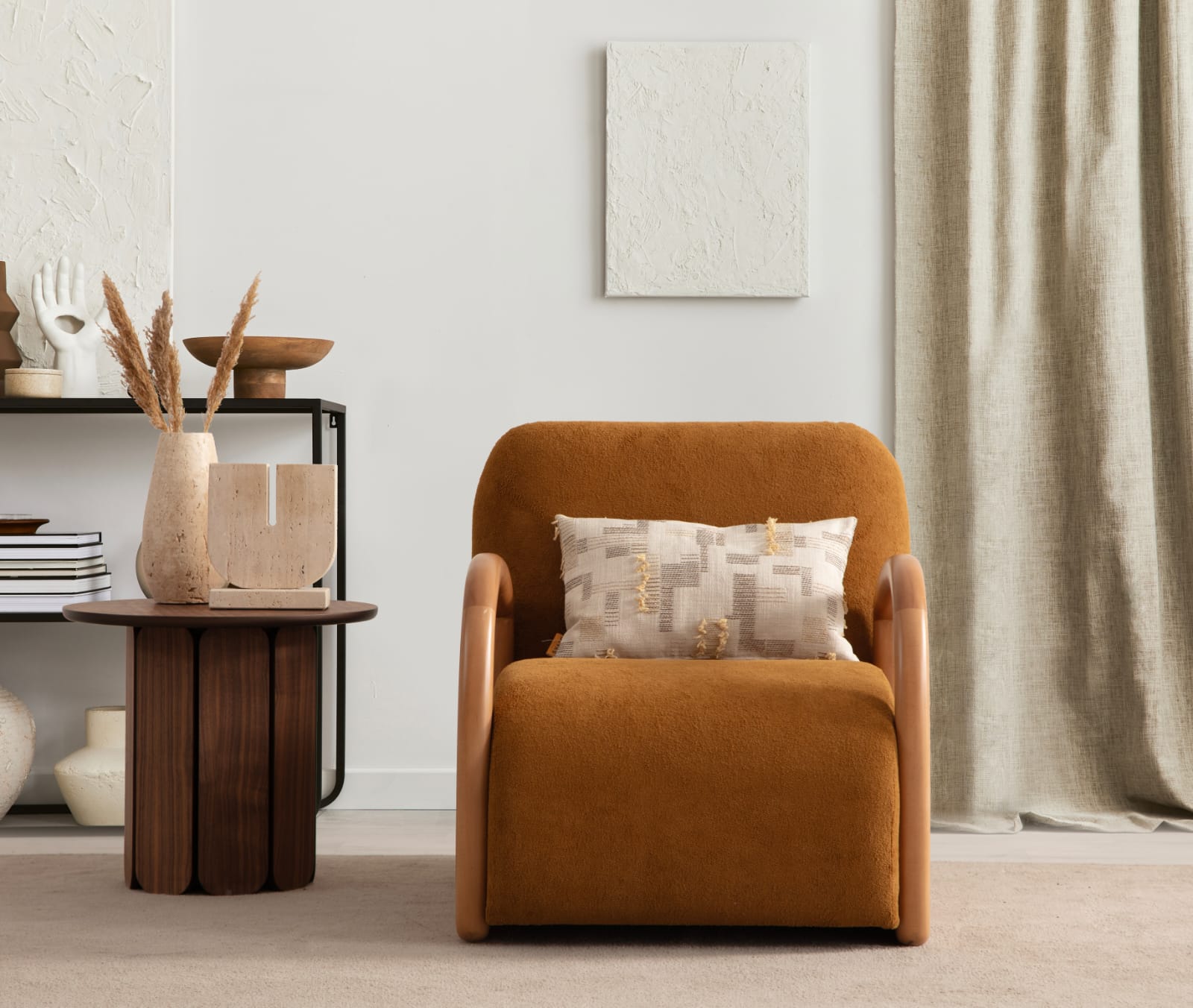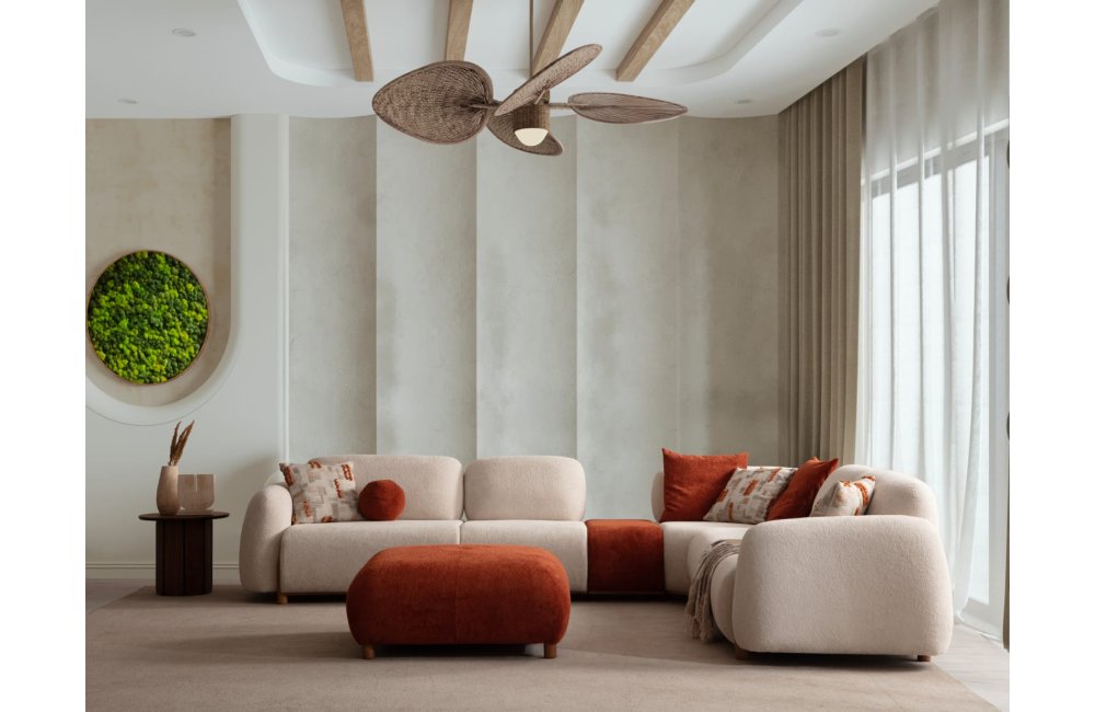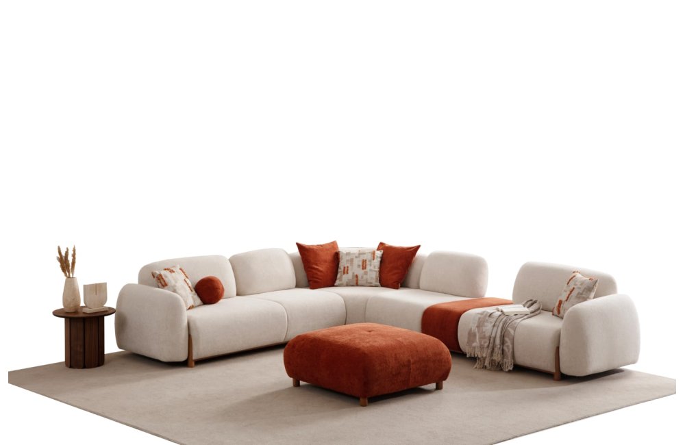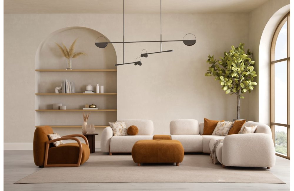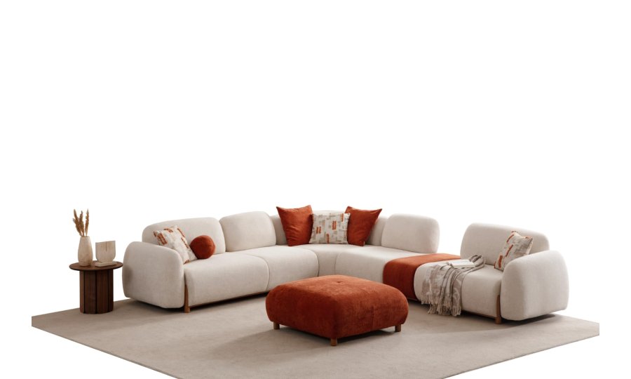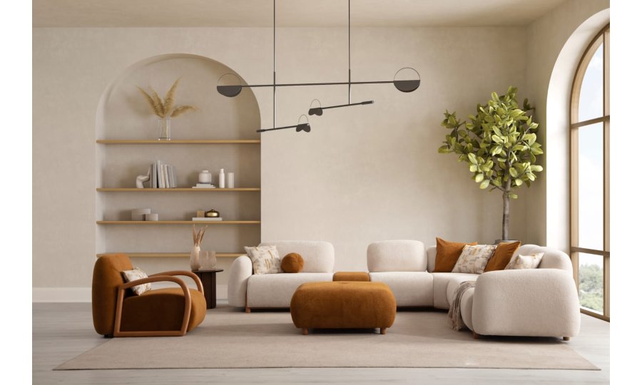 • Kontrast Renk Uyumu: Krem renginin dinginliği, kiremit rengi puf ve kırlent detaylarıyla dengelenerek mekanınıza dinamizm kazandırıyor.