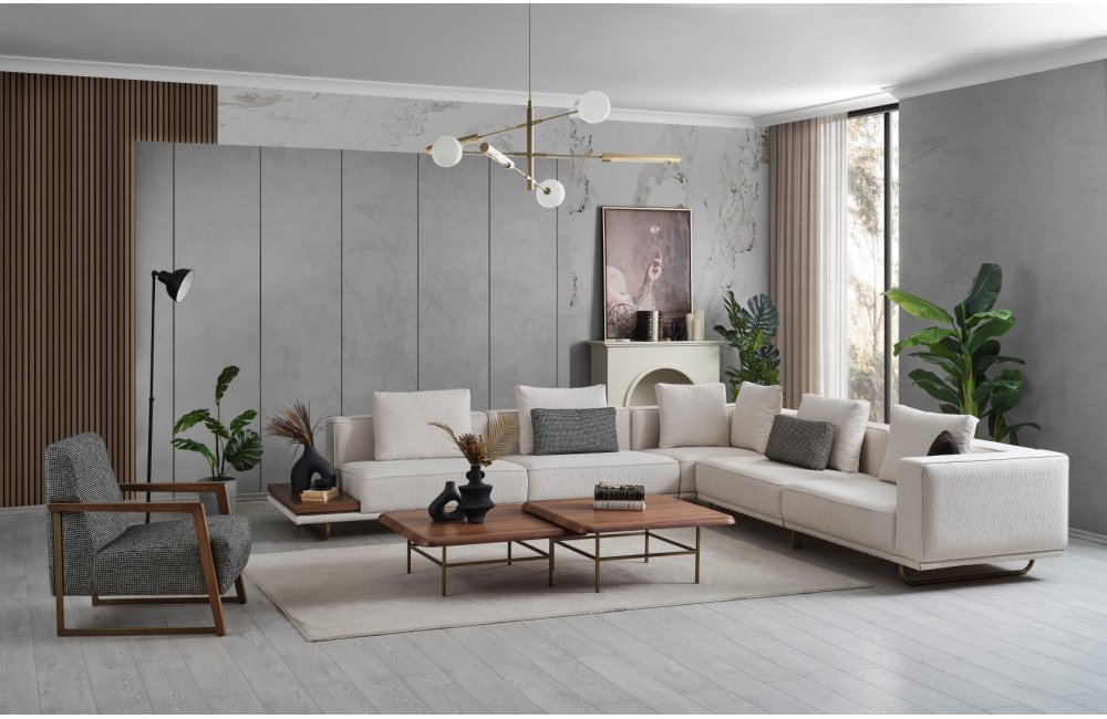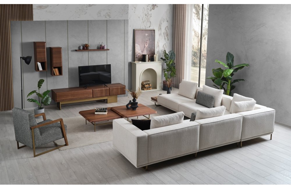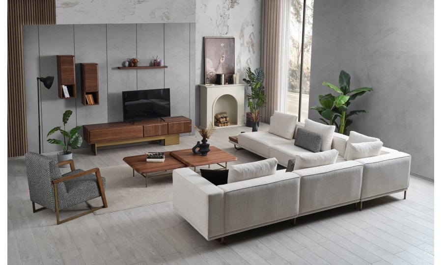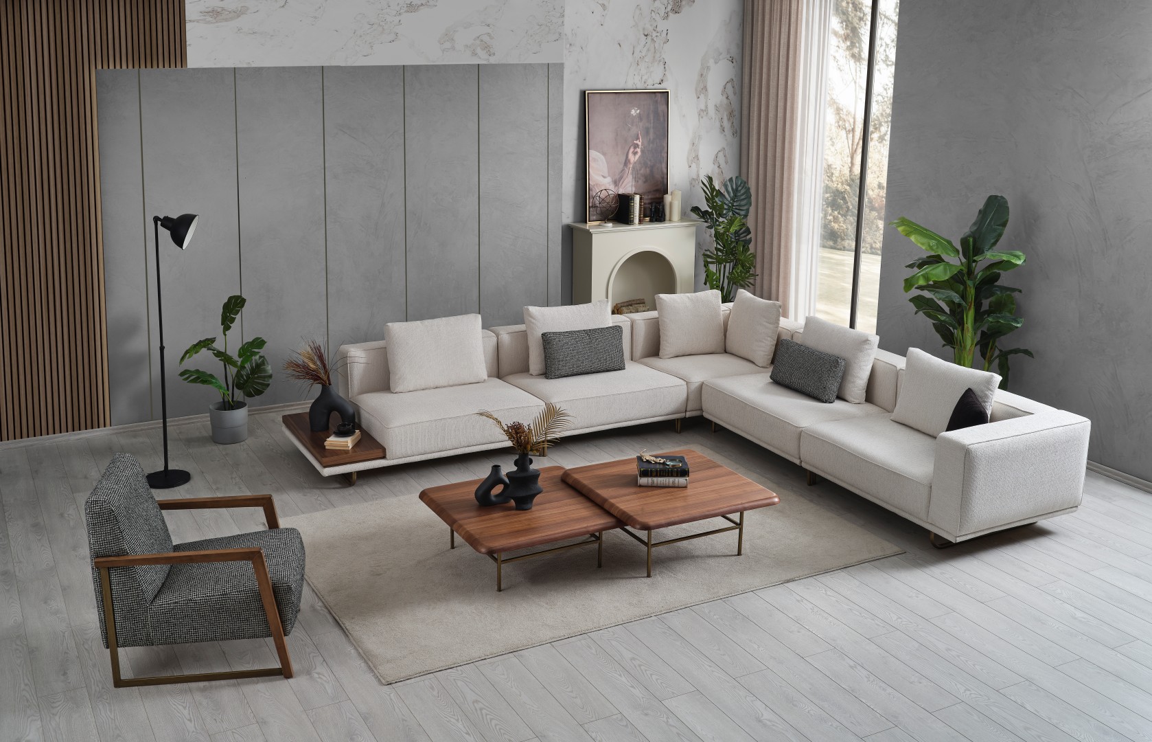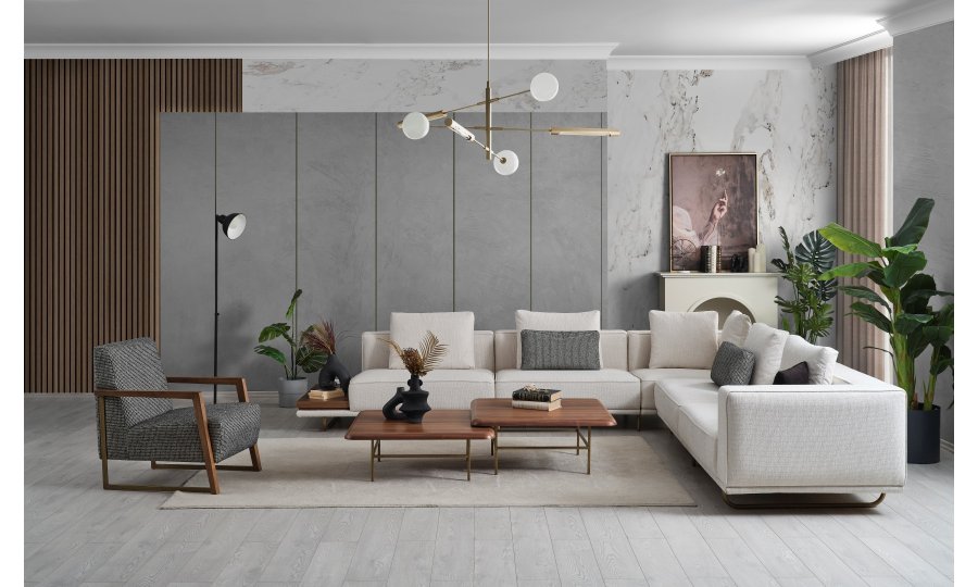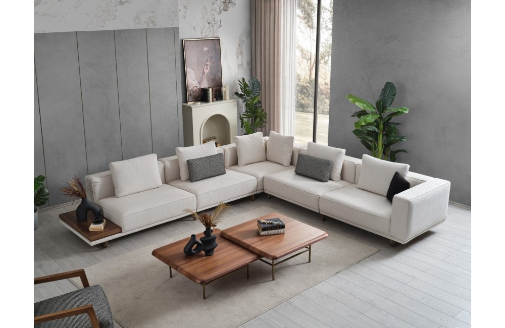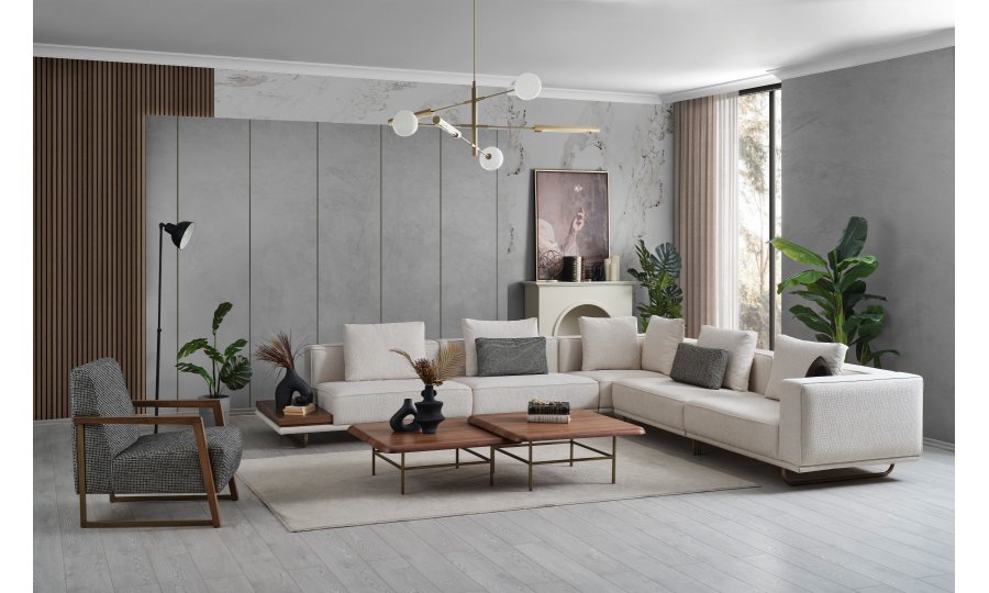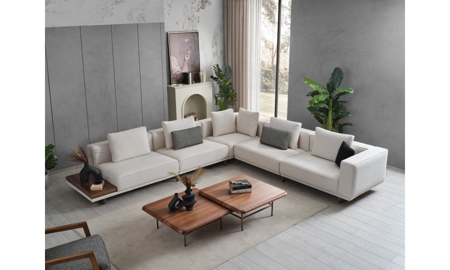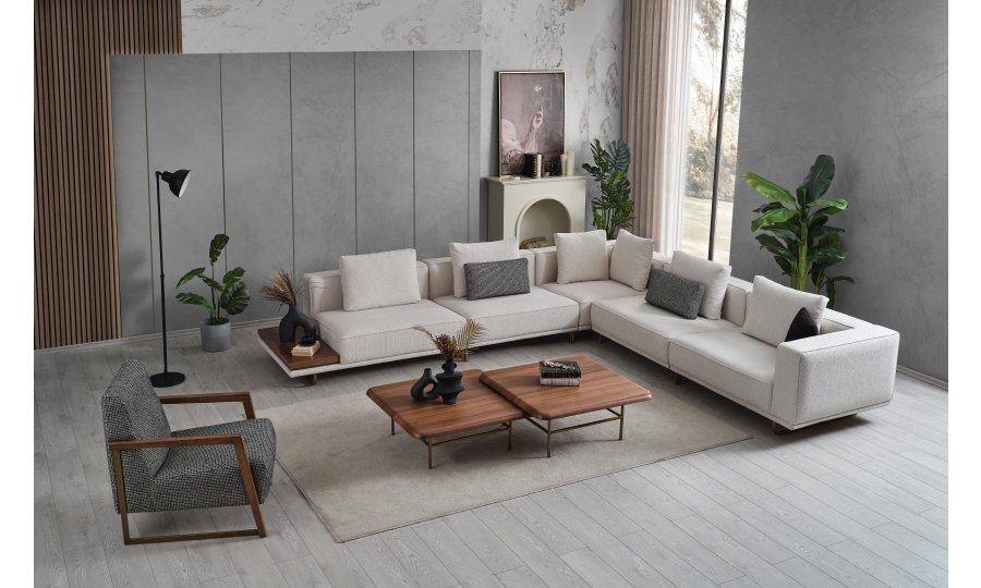 1 ad. köşe koltuktan oluşmaktadır (1 ad. yan sehpalı modül, 2 ad. ara modül, 1 ad. köşe modül ve 1 ad. kollu modül).