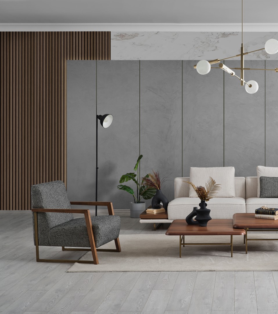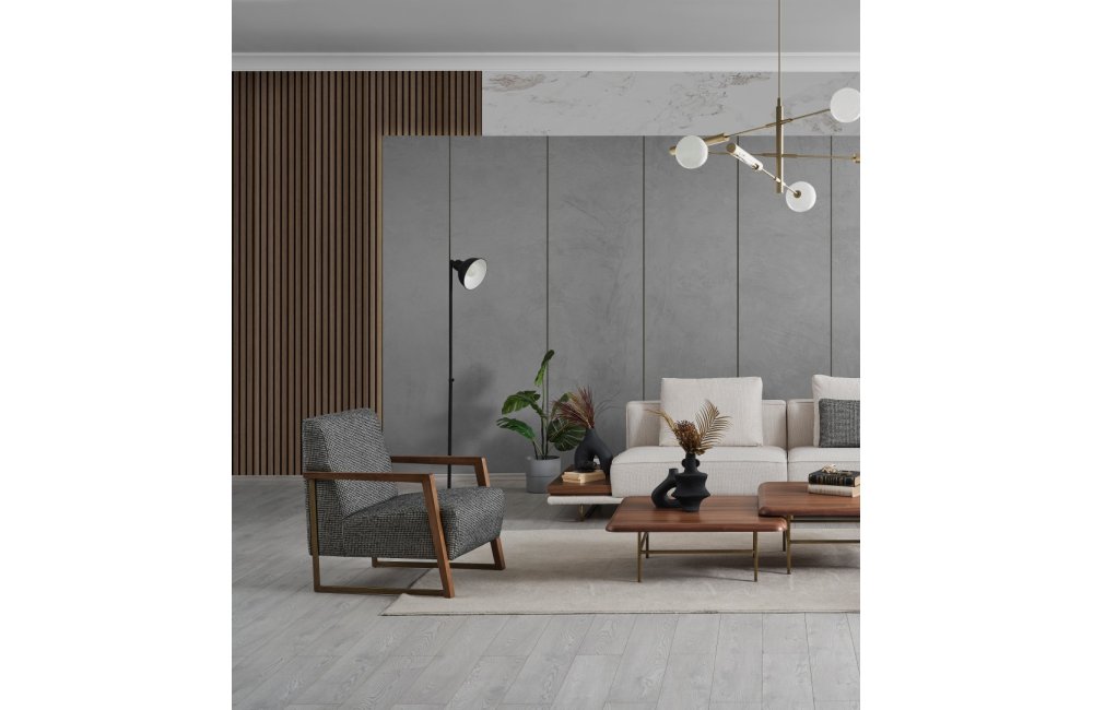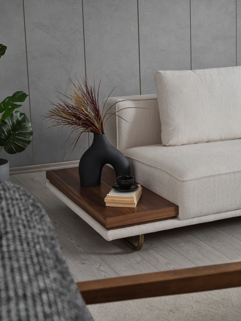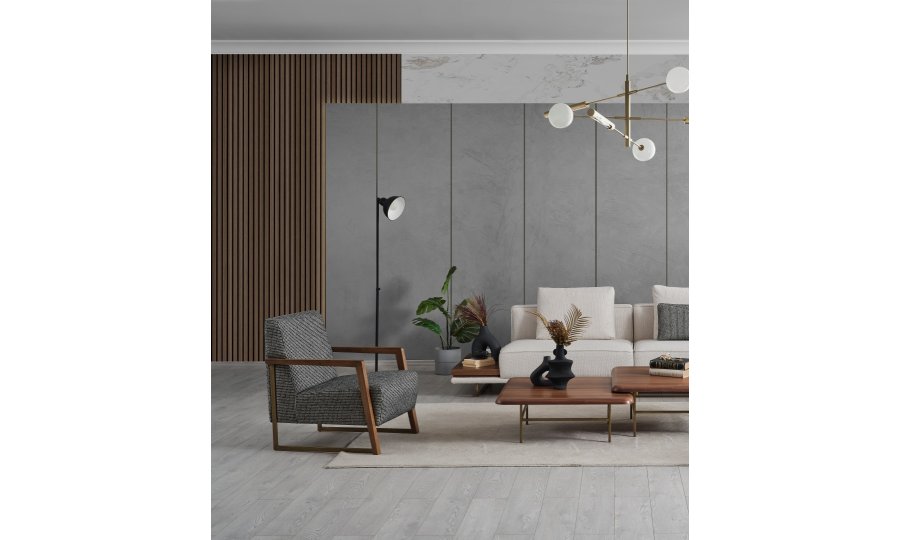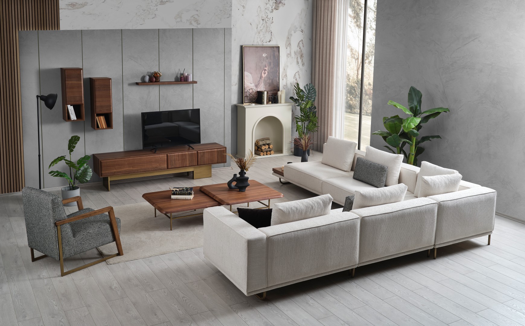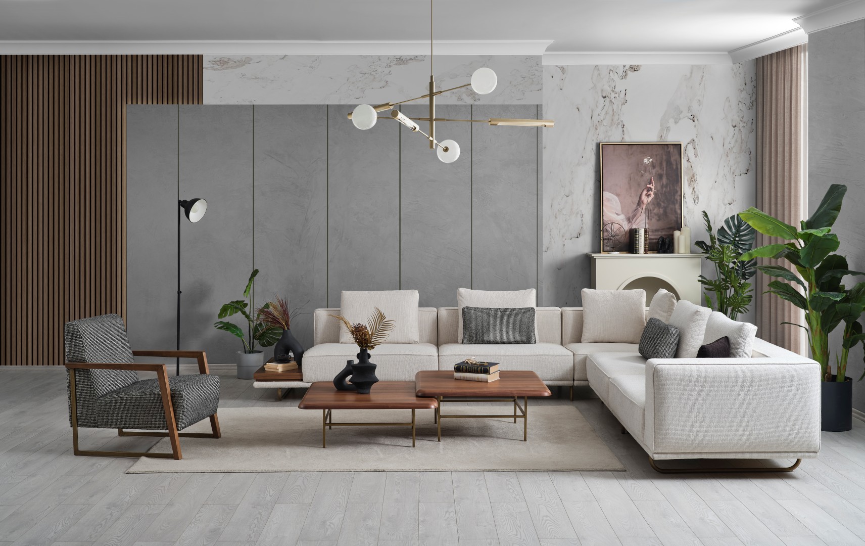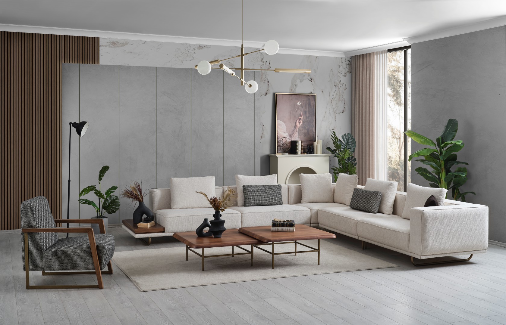 1 ad. köşe koltuktan oluşmaktadır (1 ad. yan sehpalı modül, 2 ad. ara modül, 1 ad. köşe modül ve 1 ad. kollu modül).