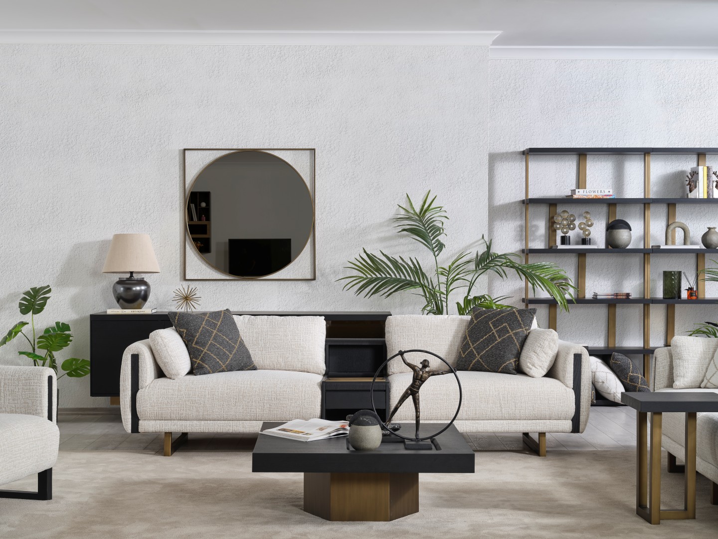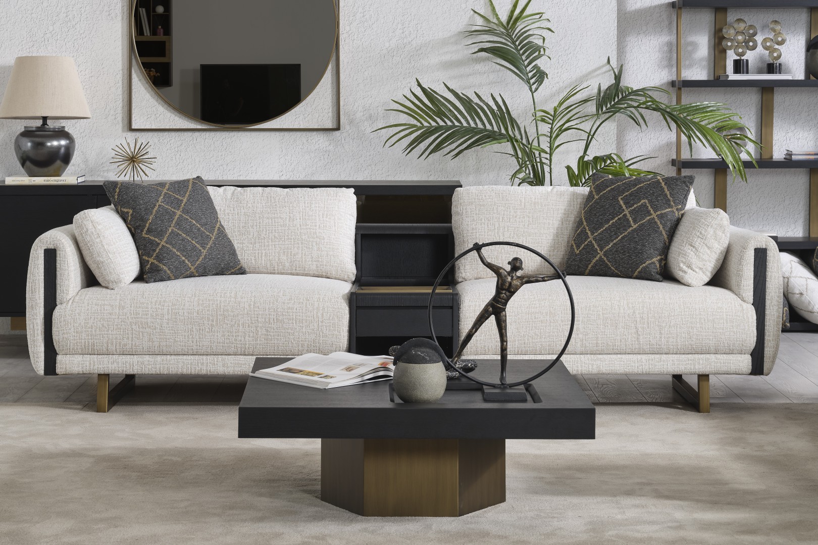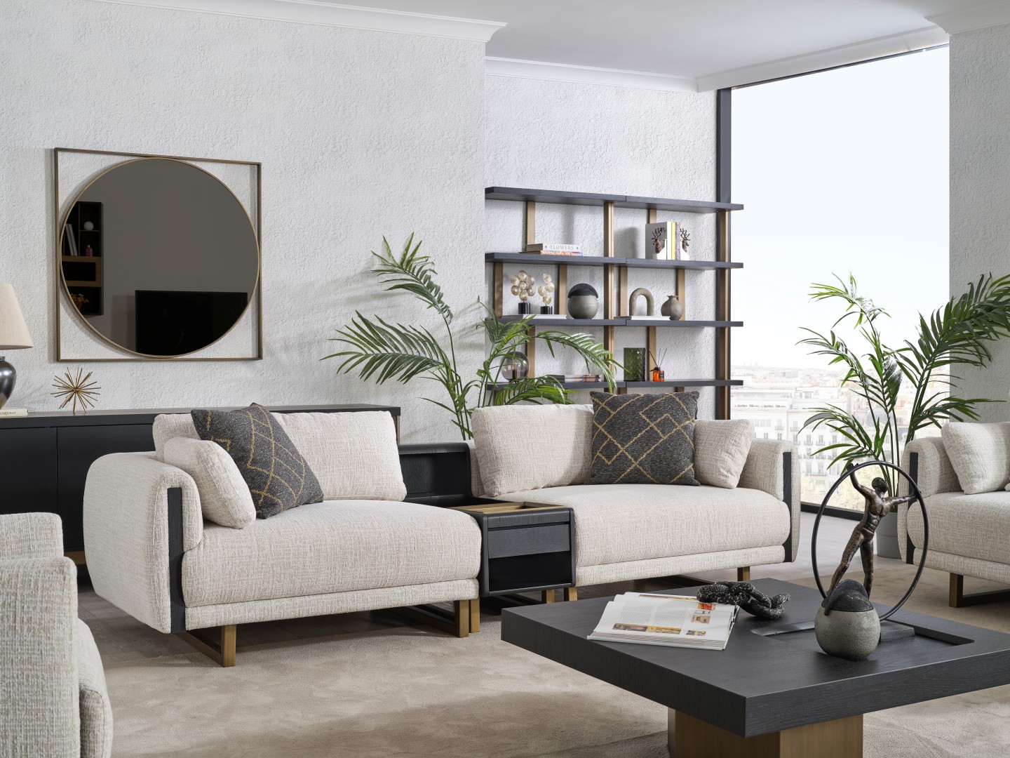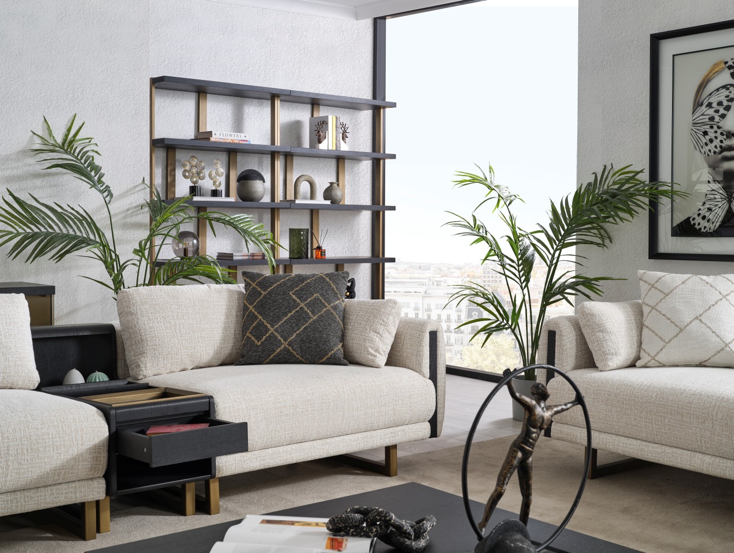 • Tasarım Detayları: Kol yanlarındaki dikey antrasit paneller ve yerden yüksek gold metal ayaklar, modern ve havadar bir görünüm sağlar.