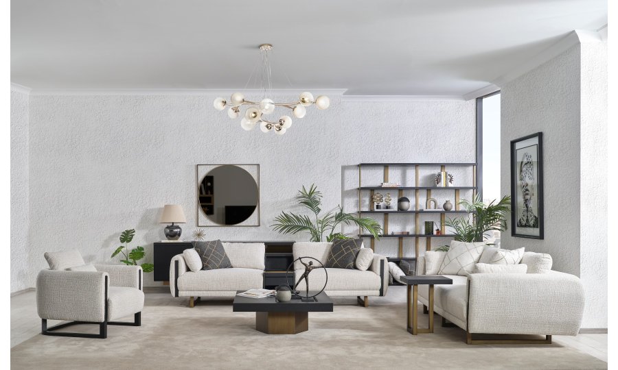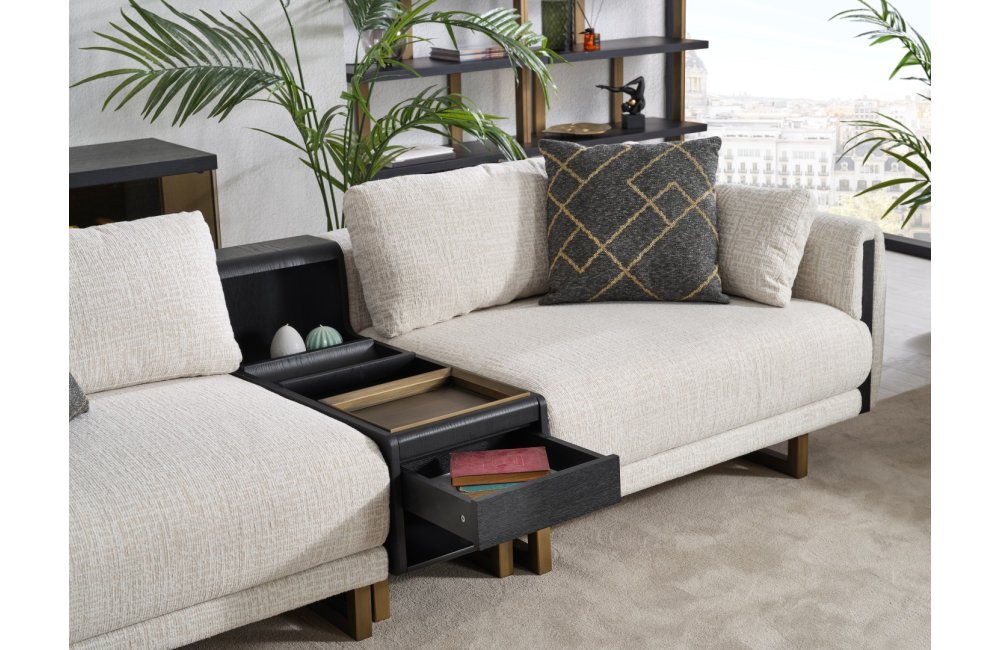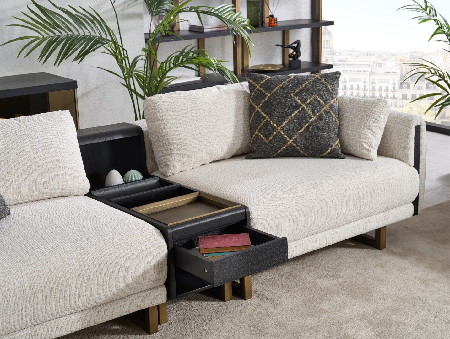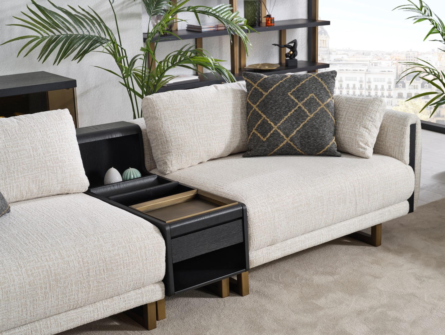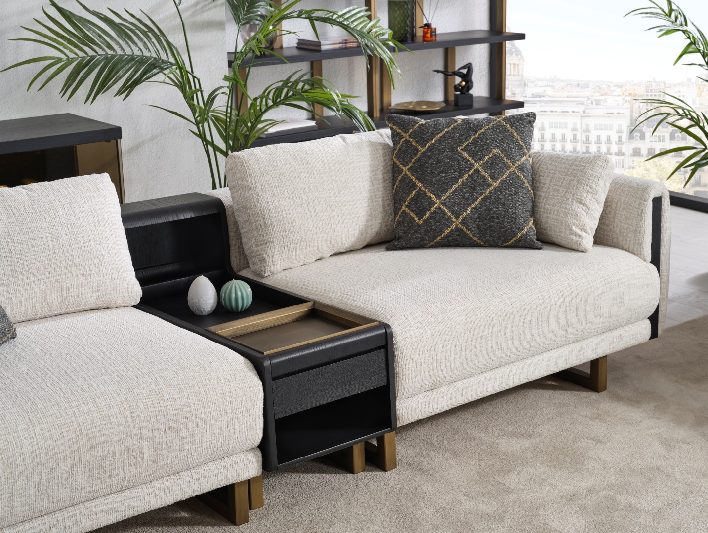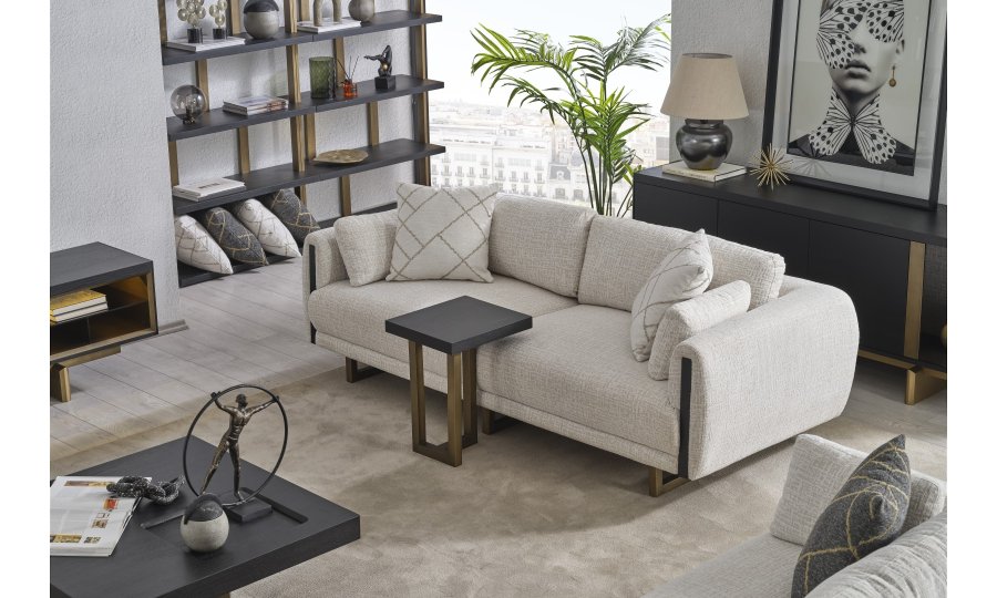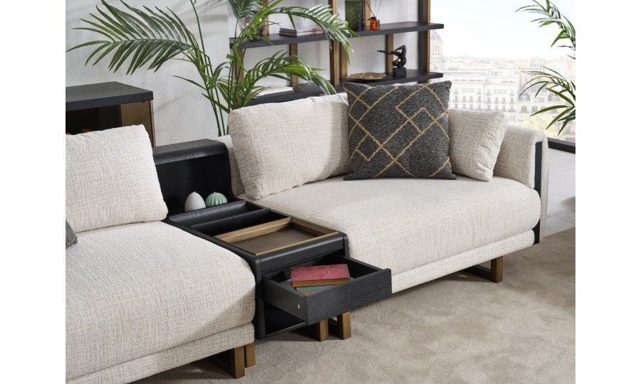• Tasarım Detayları: Kol yanlarındaki dikey antrasit paneller ve yerden yüksek gold metal ayaklar, modern ve havadar bir görünüm sağlar.