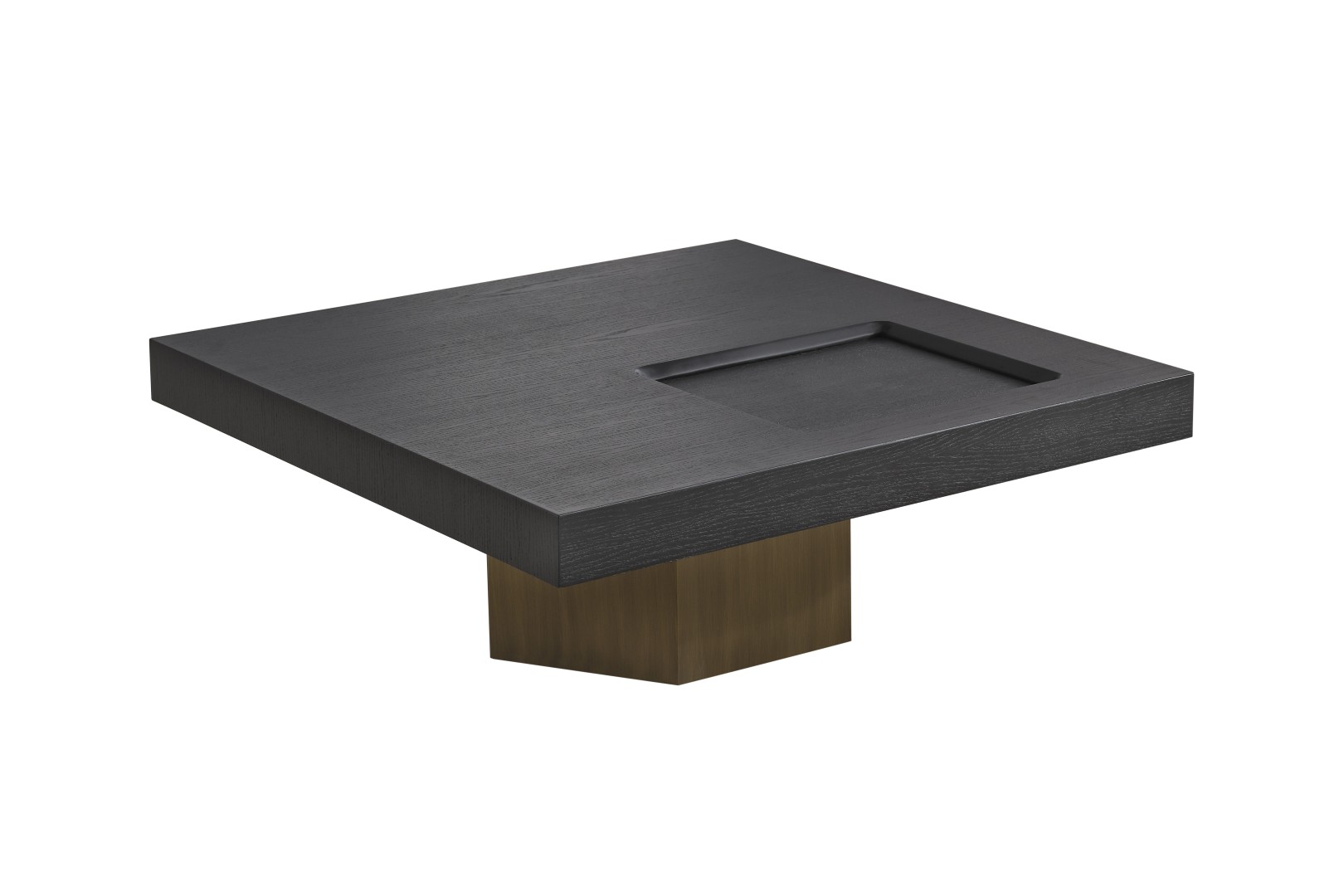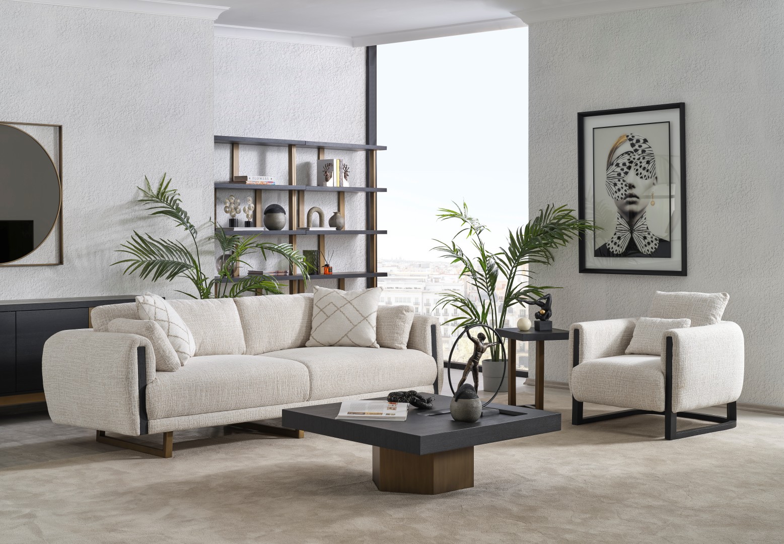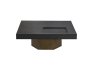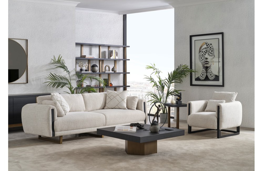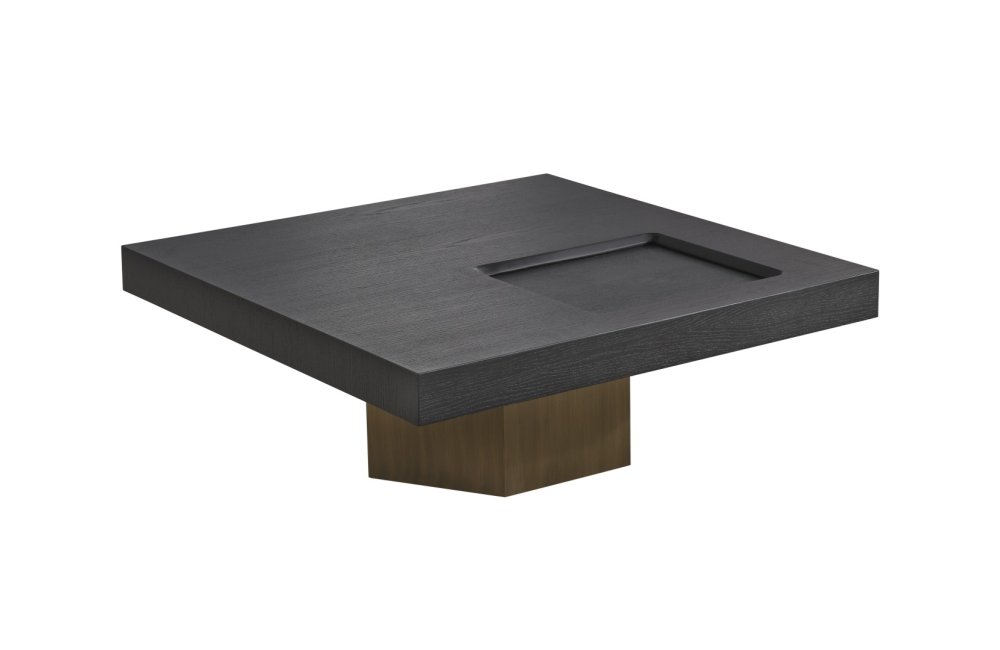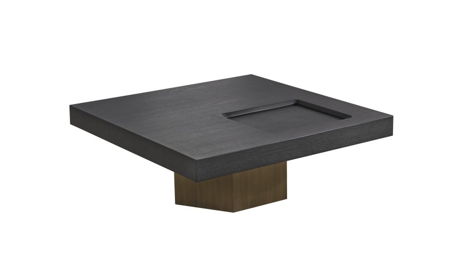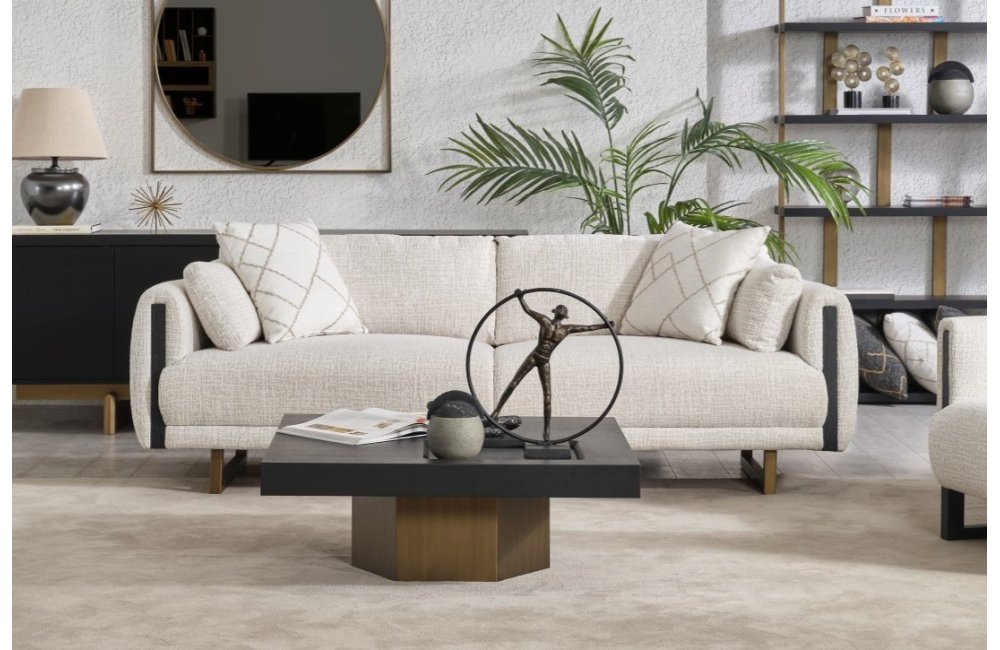 • Geometrik Kaide: Sehpanın tablasını taşıyan kalın, prizmatik formdaki gold/bronz ayak, mobilyaya anıtsal bir duruş kazandırır. Yerden hafif yüksek yapısı, temizlik kolaylığı sağlarken mekanın ferah görünmesini destekler.