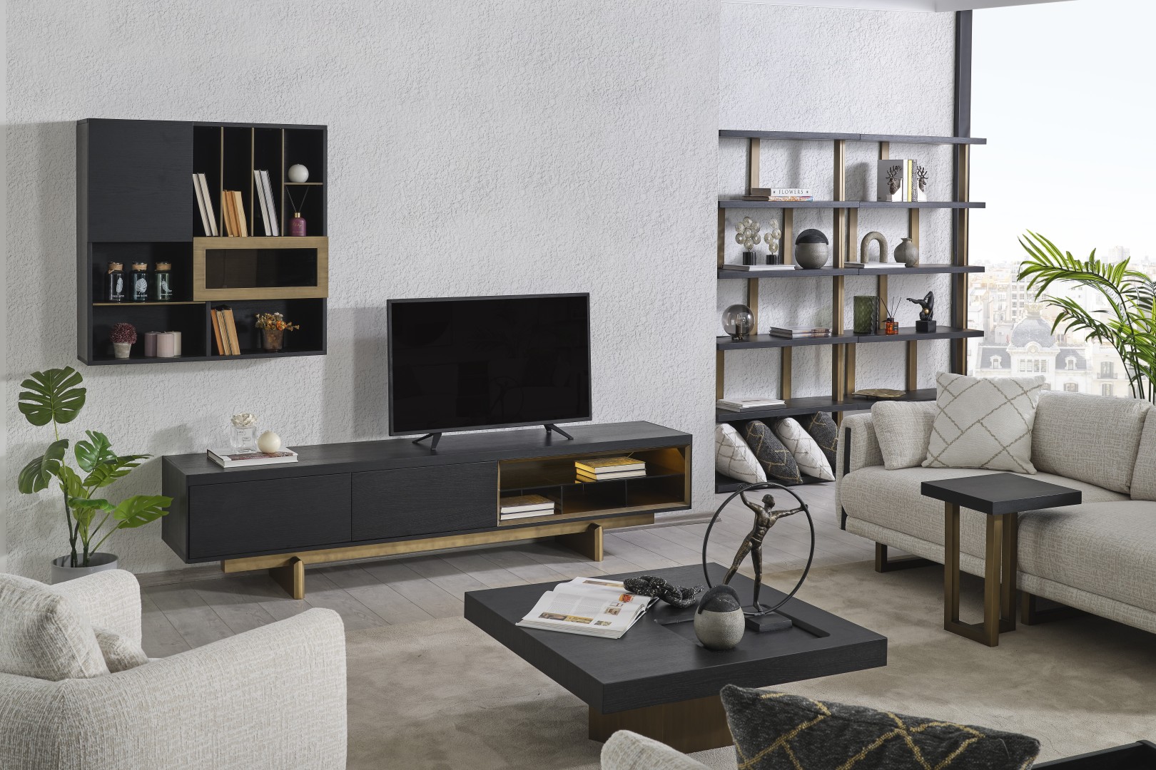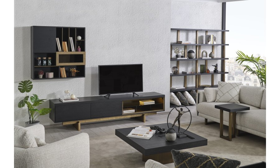 • Özel Tasarım Tabla: Geniş kare formuyla kullanım kolaylığı sunan tabla, üzerinde yer alan gömme dekoratif bölme (tray alanı) sayesinde kumandalarınız veya dekoratif objeleriniz için şık bir alan sunar. Antrasit rengin ağırlığı, ahşabın doğal dokusuyla birleşir.