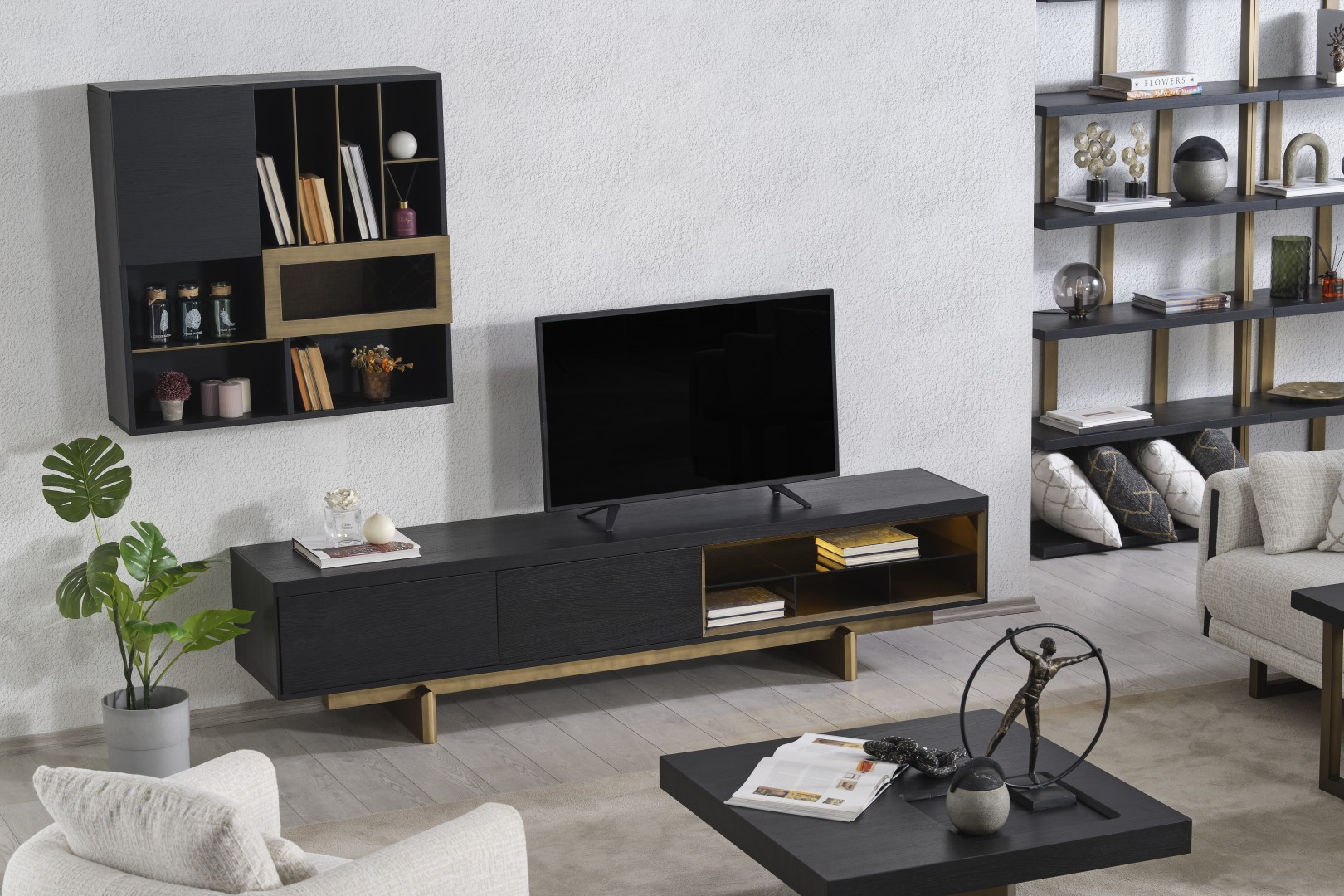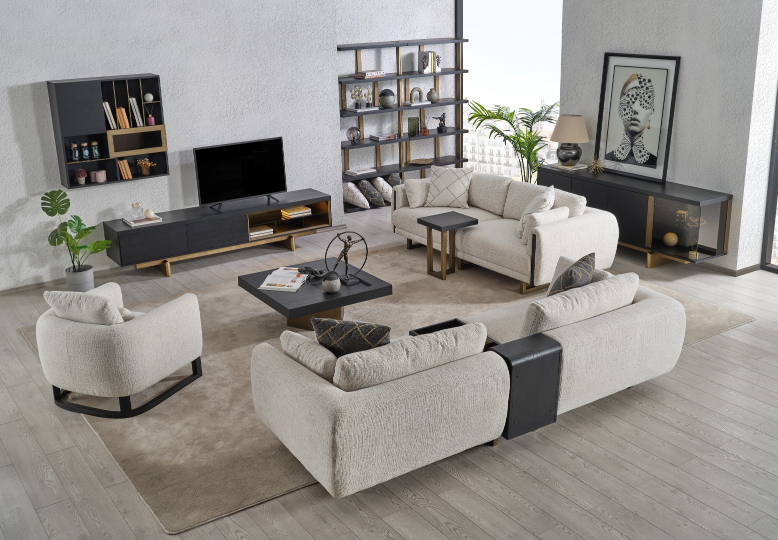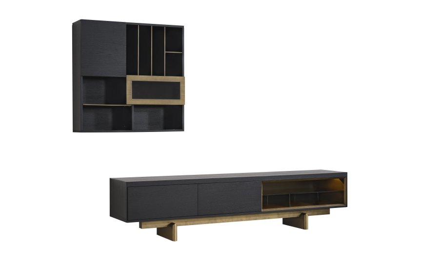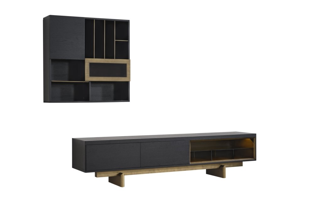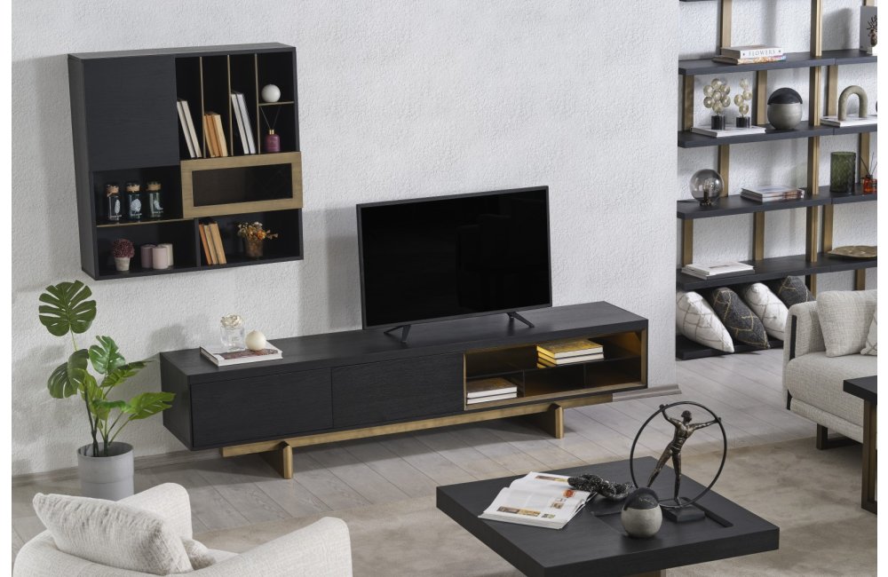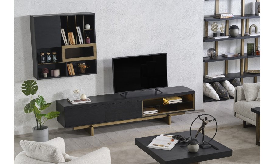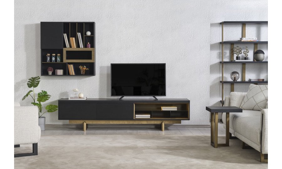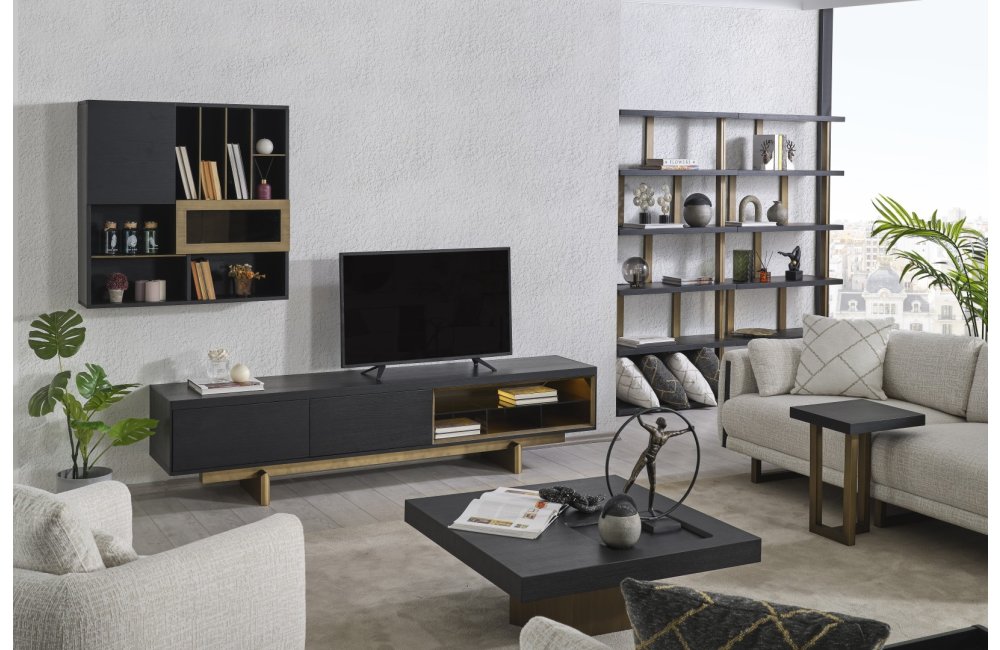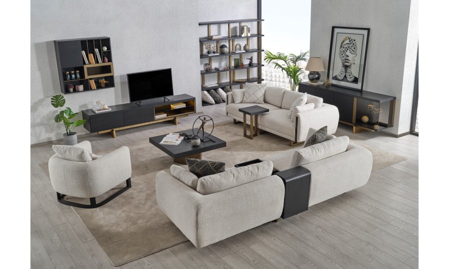 • TV Ünitesi: Kapalı saklama alanları ve açık raflarıyla hem teknolojik cihazlarınızı hem de dekoratif objelerinizi düzenler. Alt modüldeki gold detaylar, salonun genel tasarım diliyle kusursuz bir uyum içindedir.