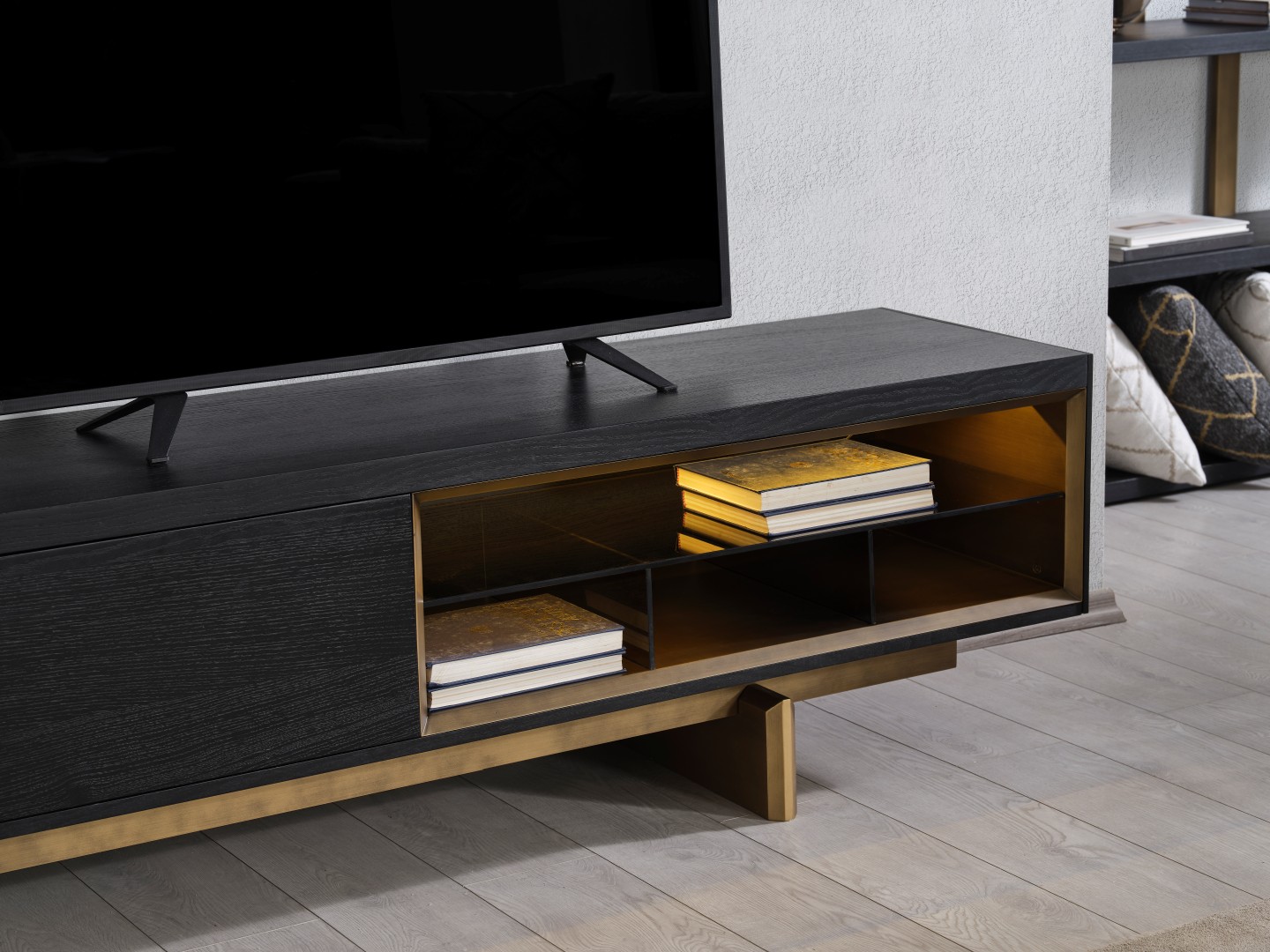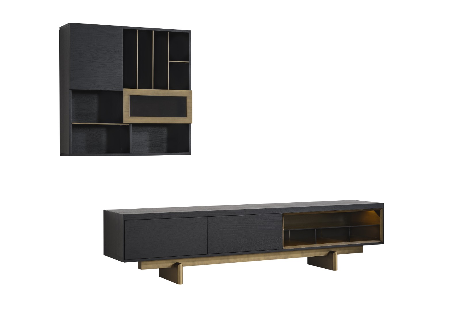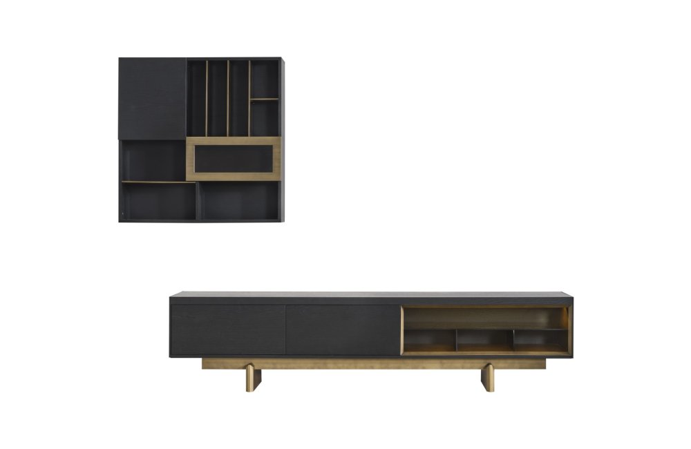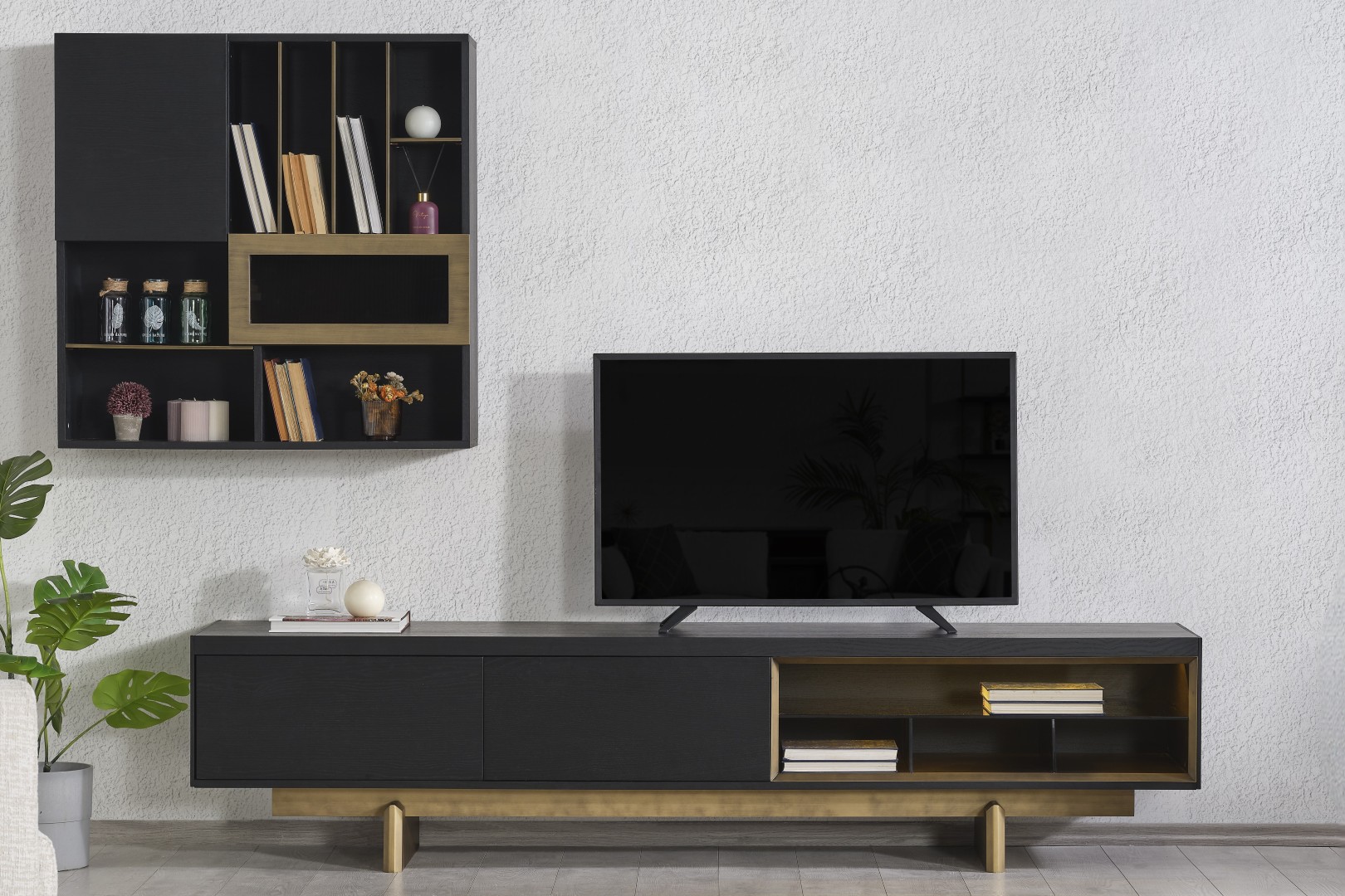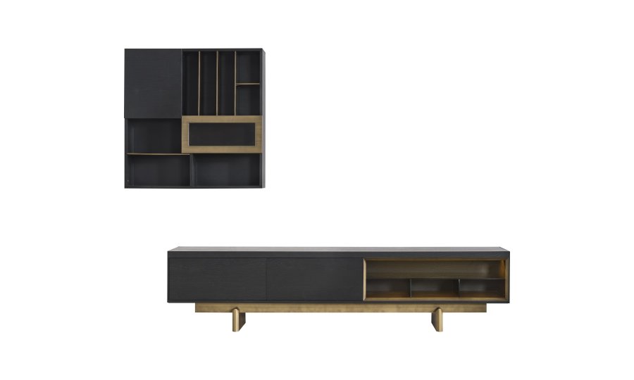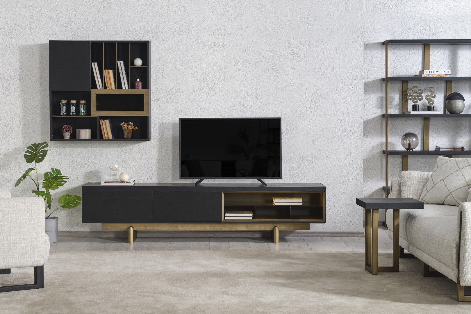 • TV Ünitesi: Kapalı saklama alanları ve açık raflarıyla hem teknolojik cihazlarınızı hem de dekoratif objelerinizi düzenler. Alt modüldeki gold detaylar, salonun genel tasarım diliyle kusursuz bir uyum içindedir.