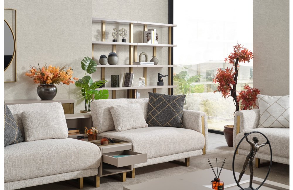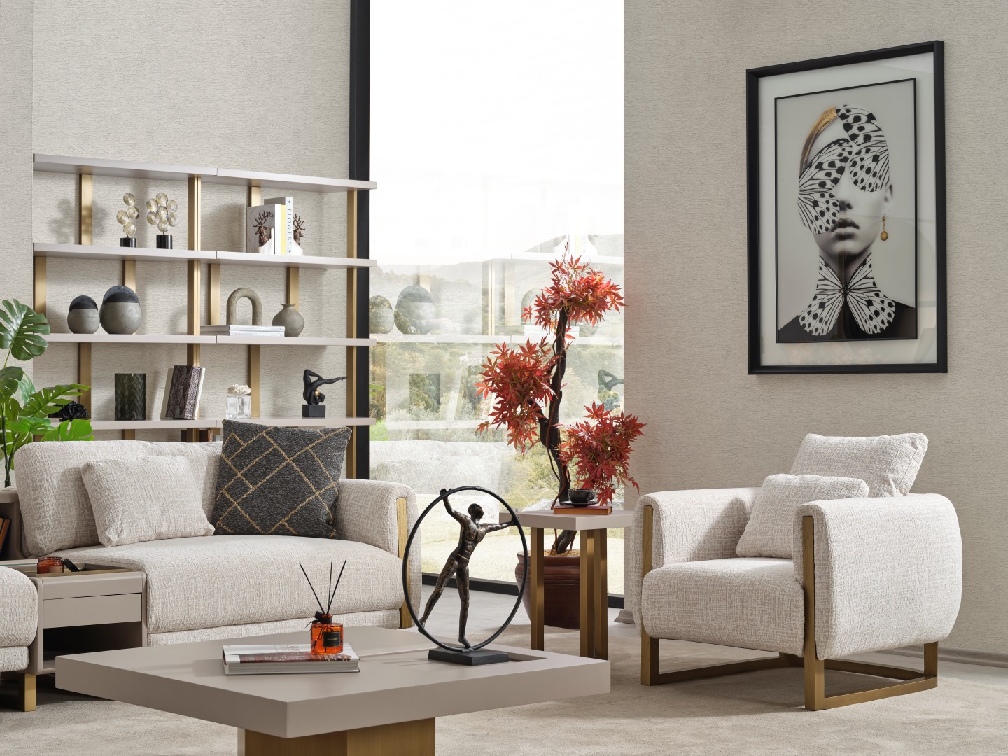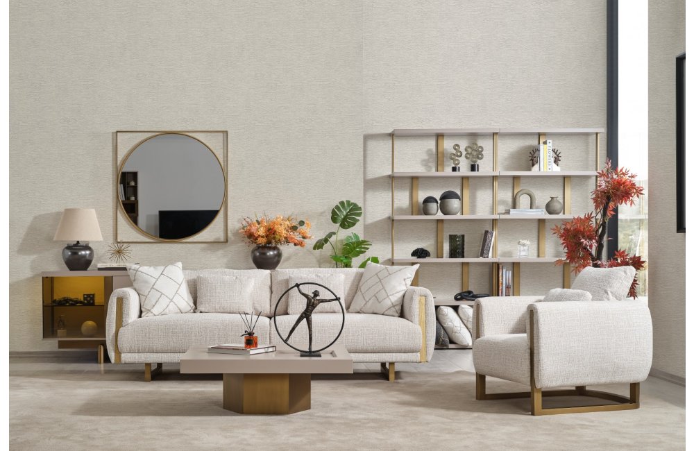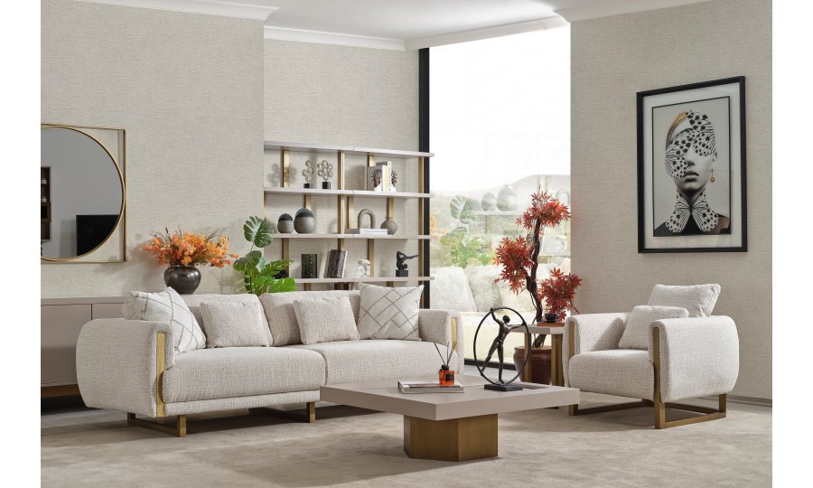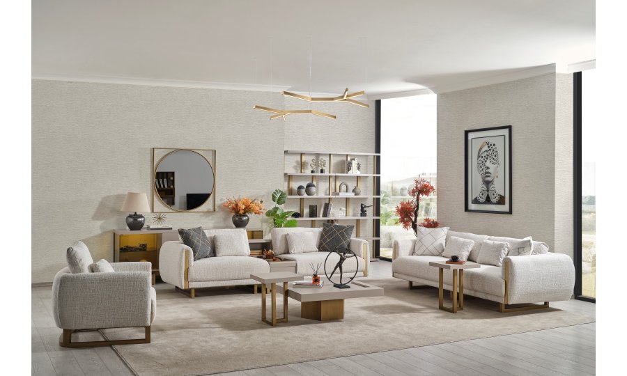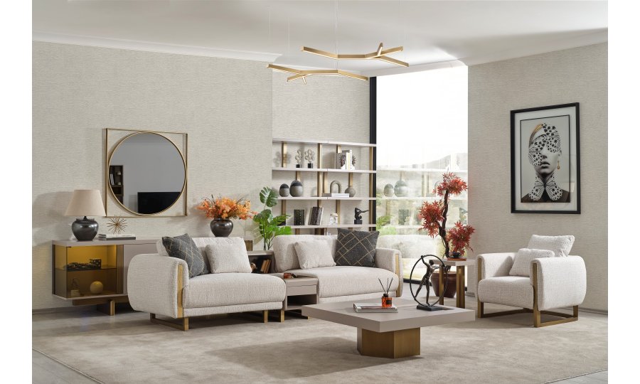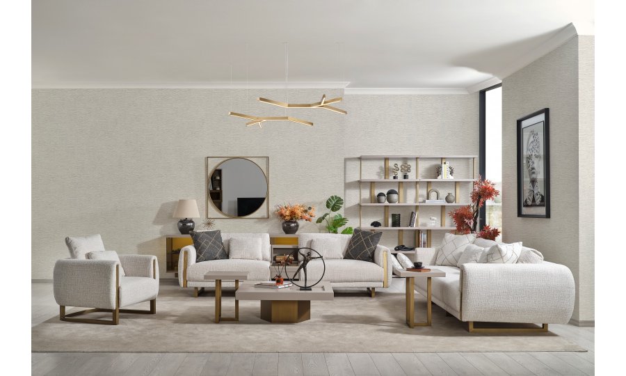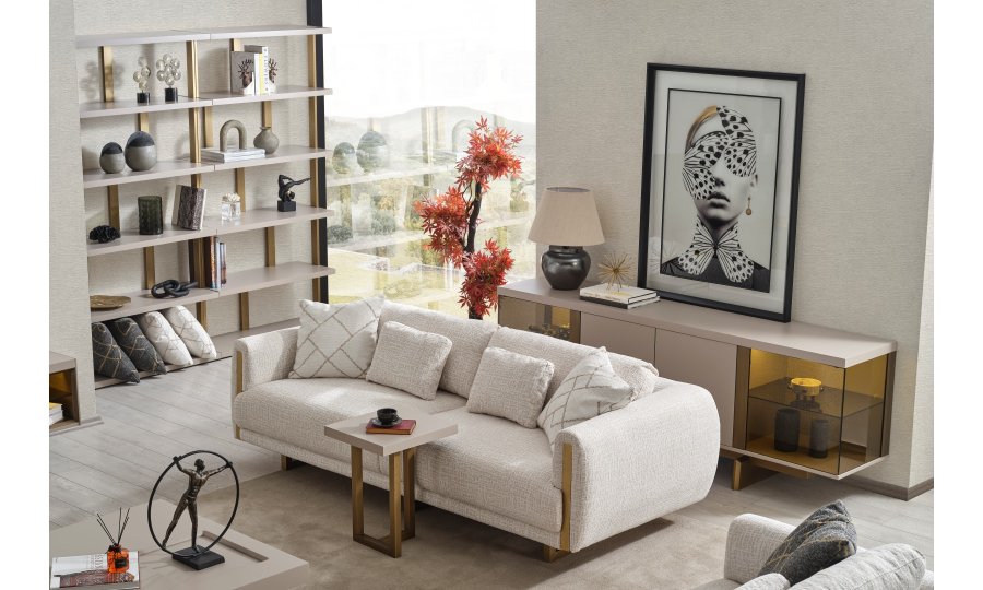 • Tasarım Detayları: Kol yanlarındaki dikey vizon paneller ve yerden yüksek gold metal ayaklar, modern ve havadar bir görünüm sağlar.
