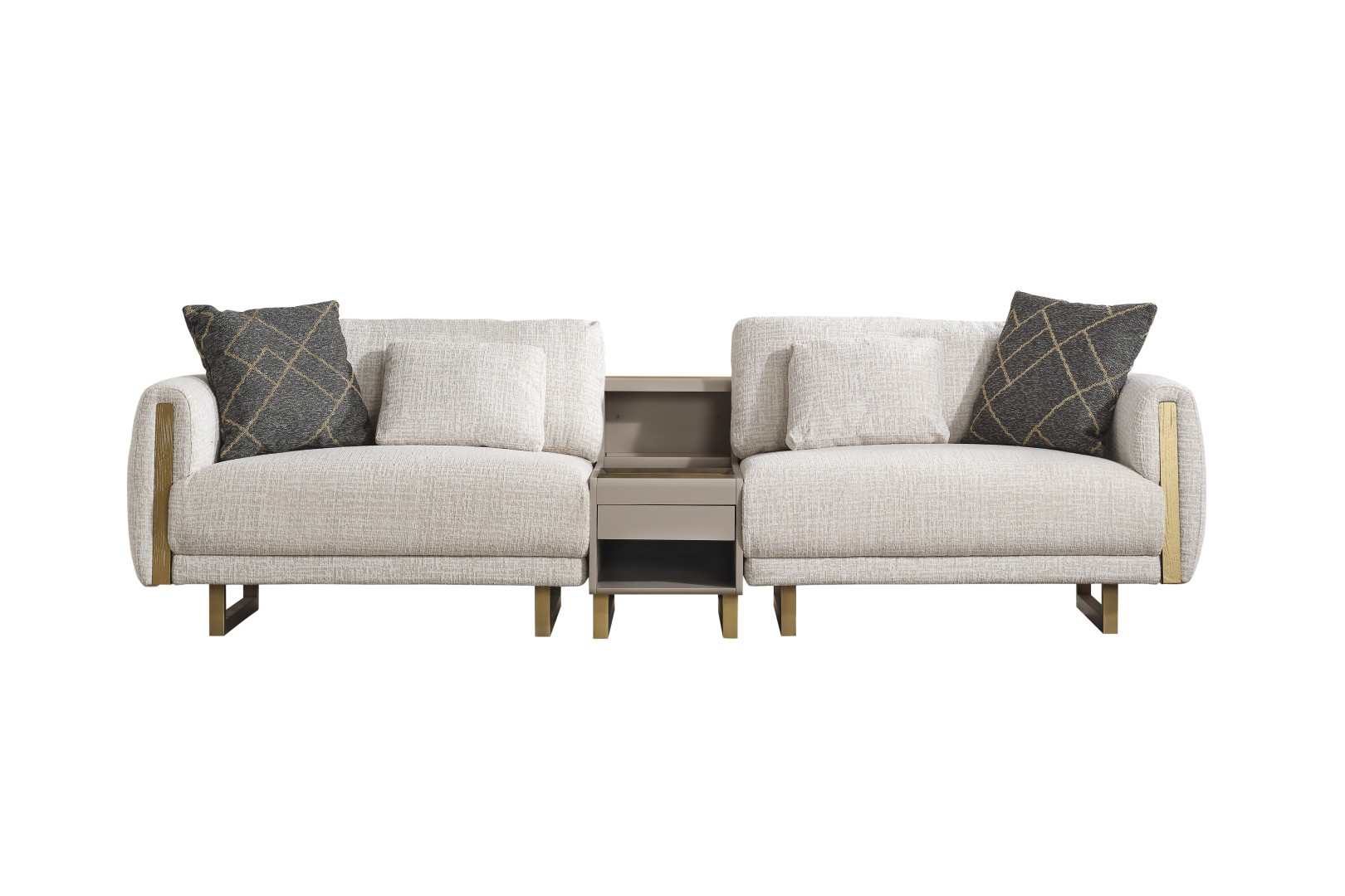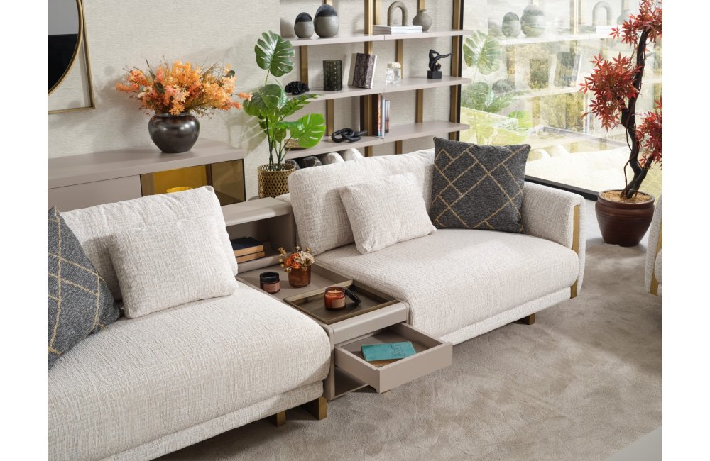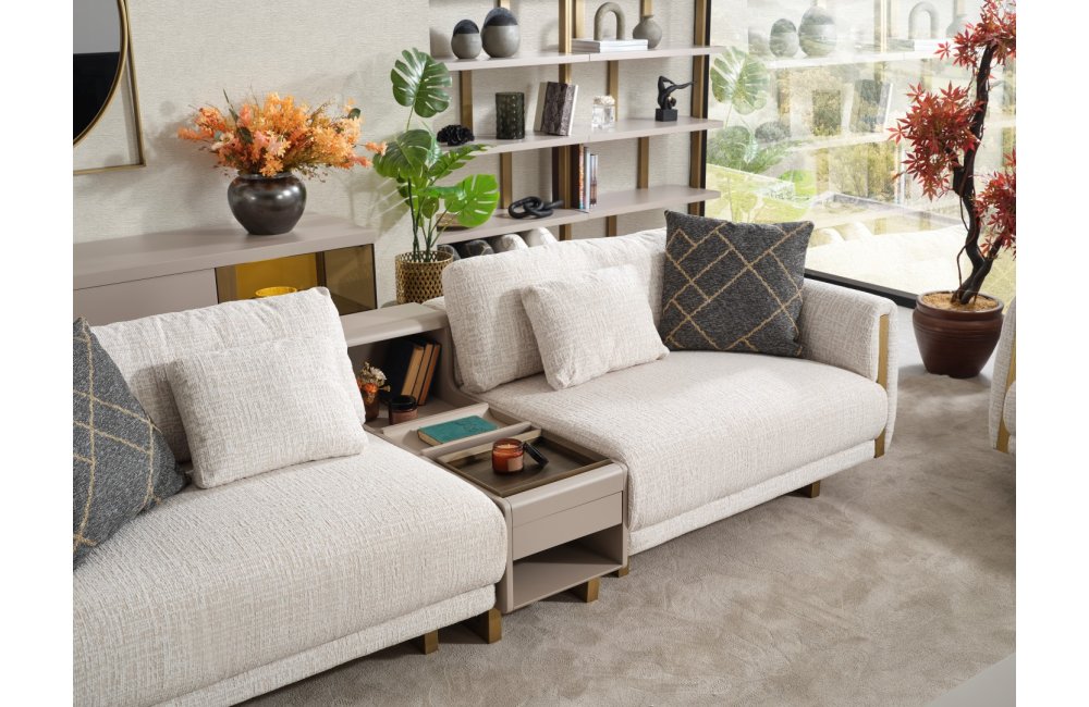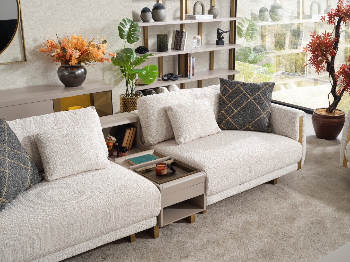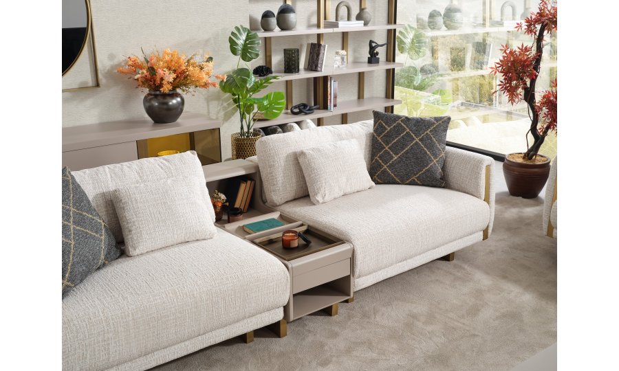 • Fonksiyonel Modül: İki koltuk arasına yerleştirilebilen, entegre sehpa ve depolama alanına sahip vizon ahşap modül, kahve keyfinizi kolaylaştırırken şıklığıyla göz doldurur.