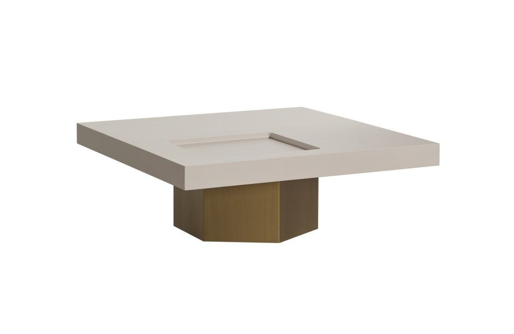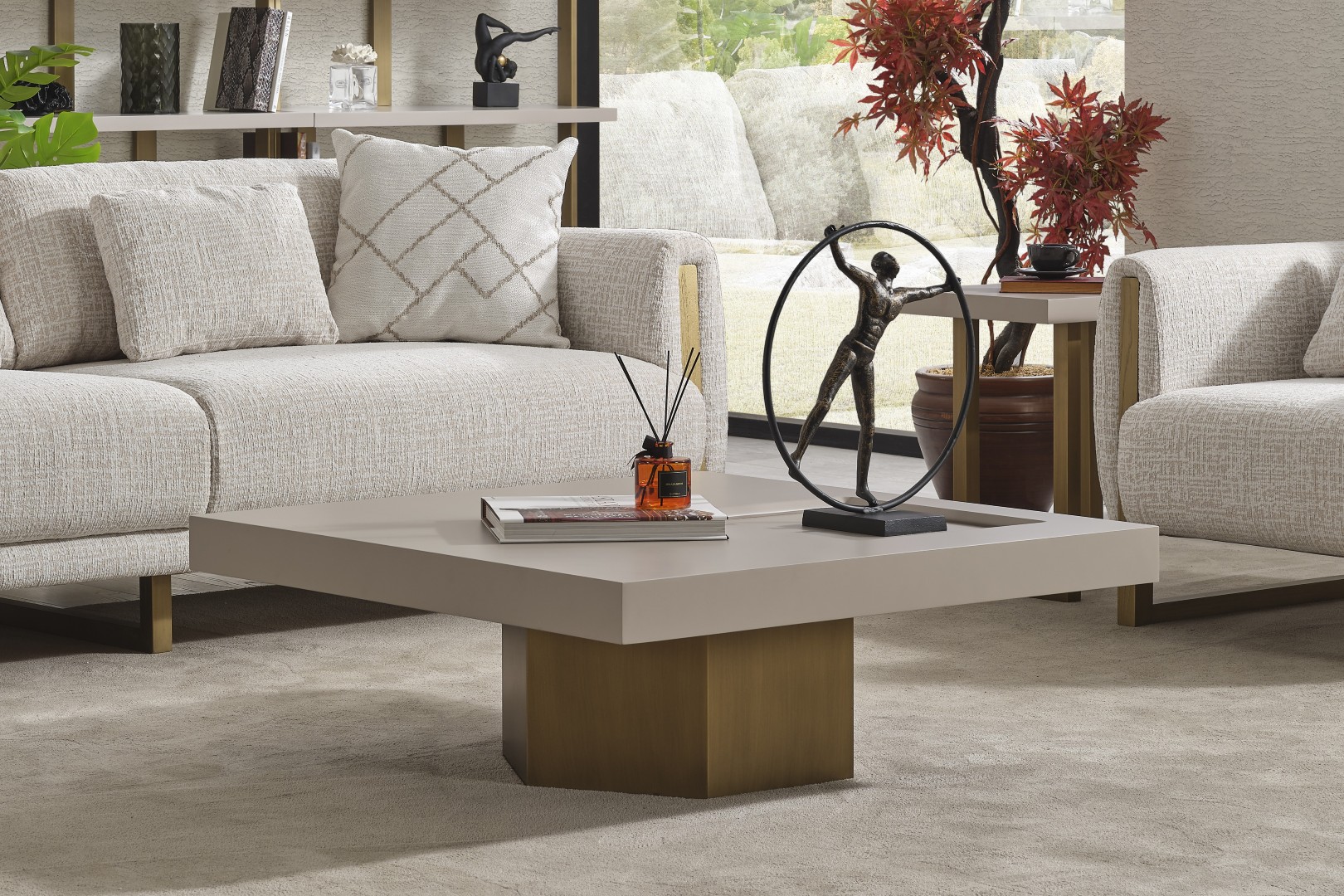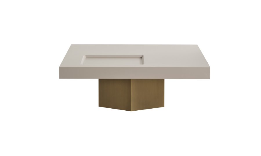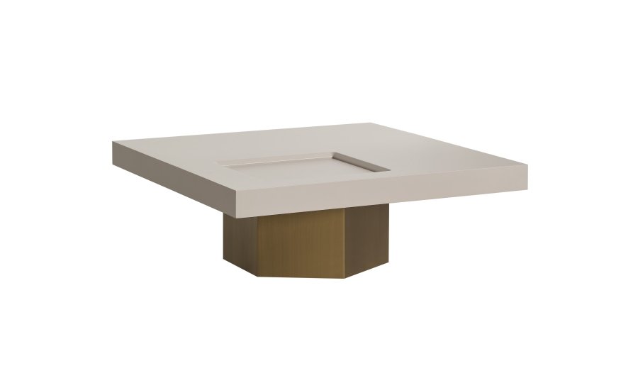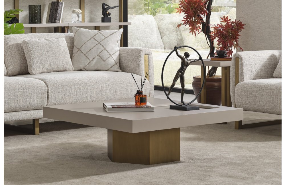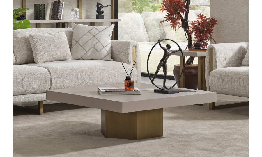 • Geometrik Kaide: Sehpanın tablasını taşıyan kalın, prizmatik formdaki gold/bronz ayak, mobilyaya anıtsal bir duruş kazandırır. Yerden hafif yüksek yapısı, temizlik kolaylığı sağlarken mekanın ferah görünmesini destekler.