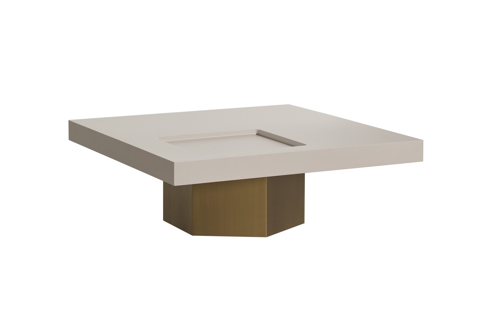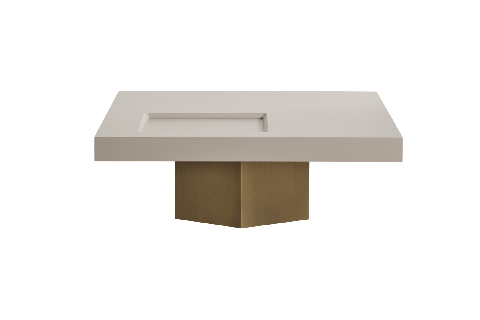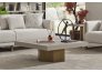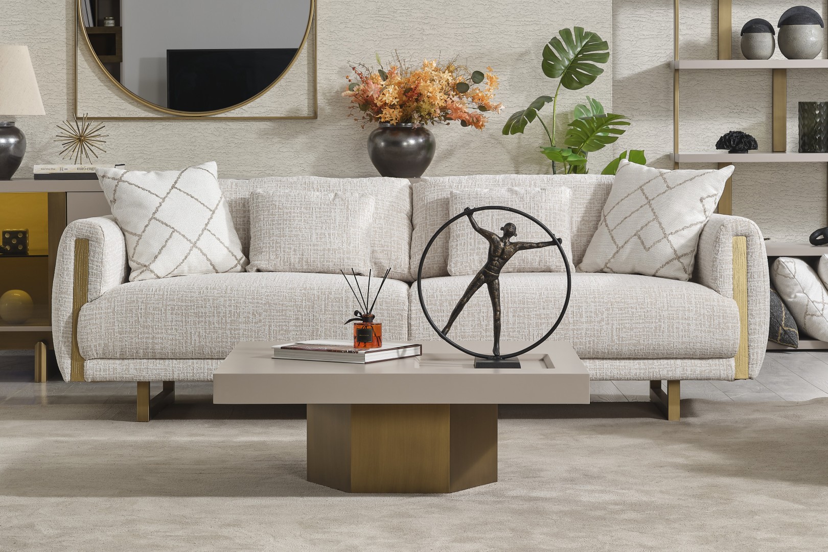 • Geometrik Kaide: Sehpanın tablasını taşıyan kalın, prizmatik formdaki gold/bronz ayak, mobilyaya anıtsal bir duruş kazandırır. Yerden hafif yüksek yapısı, temizlik kolaylığı sağlarken mekanın ferah görünmesini destekler.