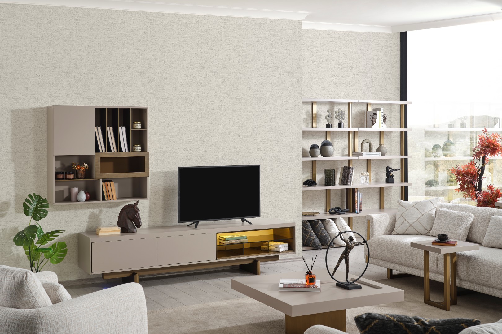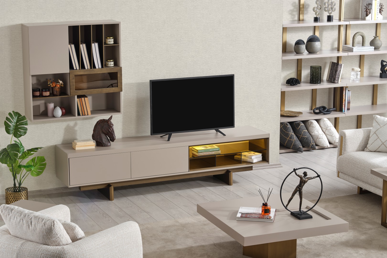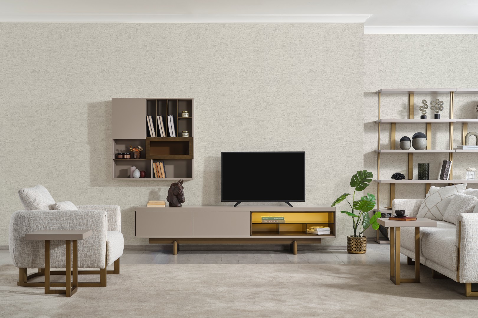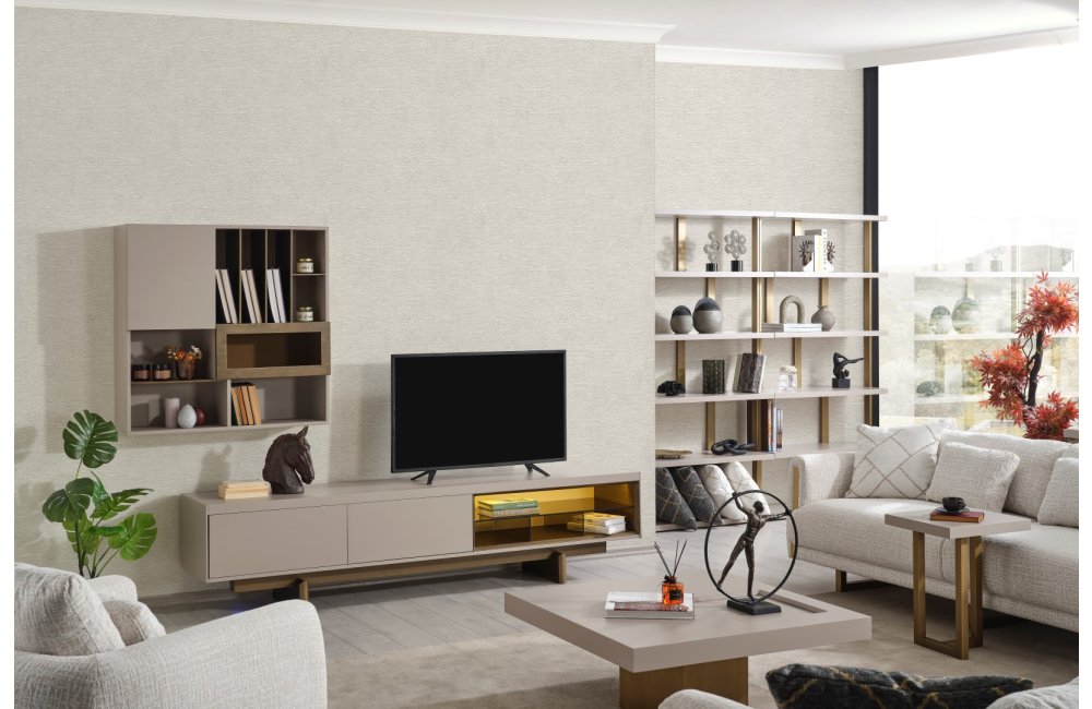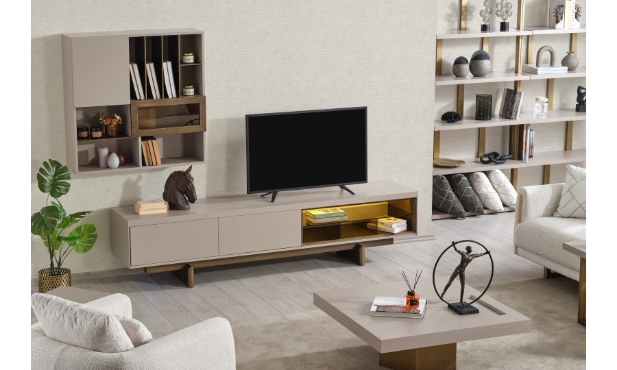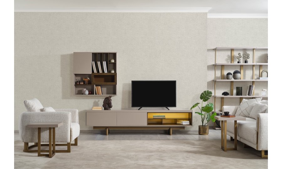 • TV Ünitesi: Kapalı saklama alanları ve açık raflarıyla hem teknolojik cihazlarınızı hem de dekoratif objelerinizi düzenler. Alt modüldeki gold detaylar, salonun genel tasarım diliyle kusursuz bir uyum içindedir.