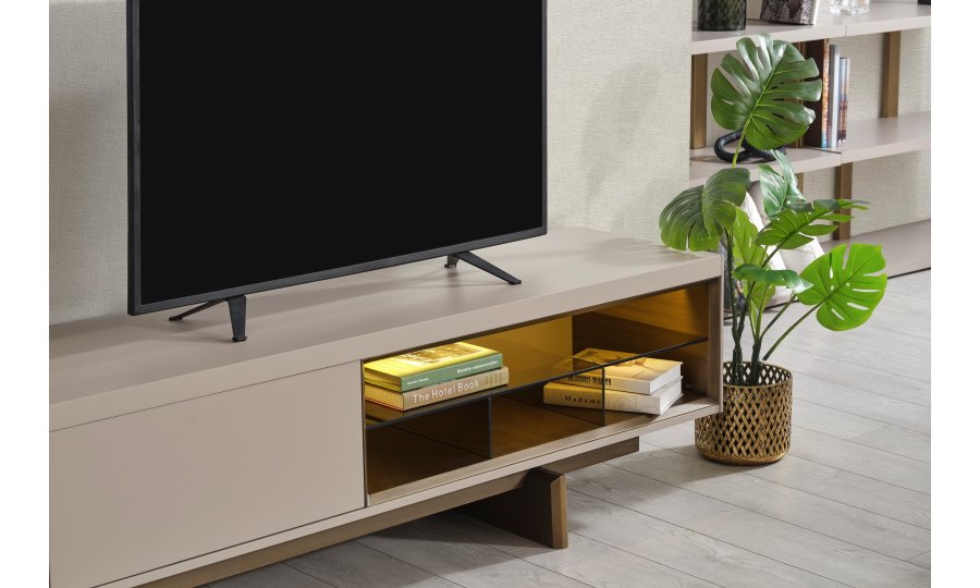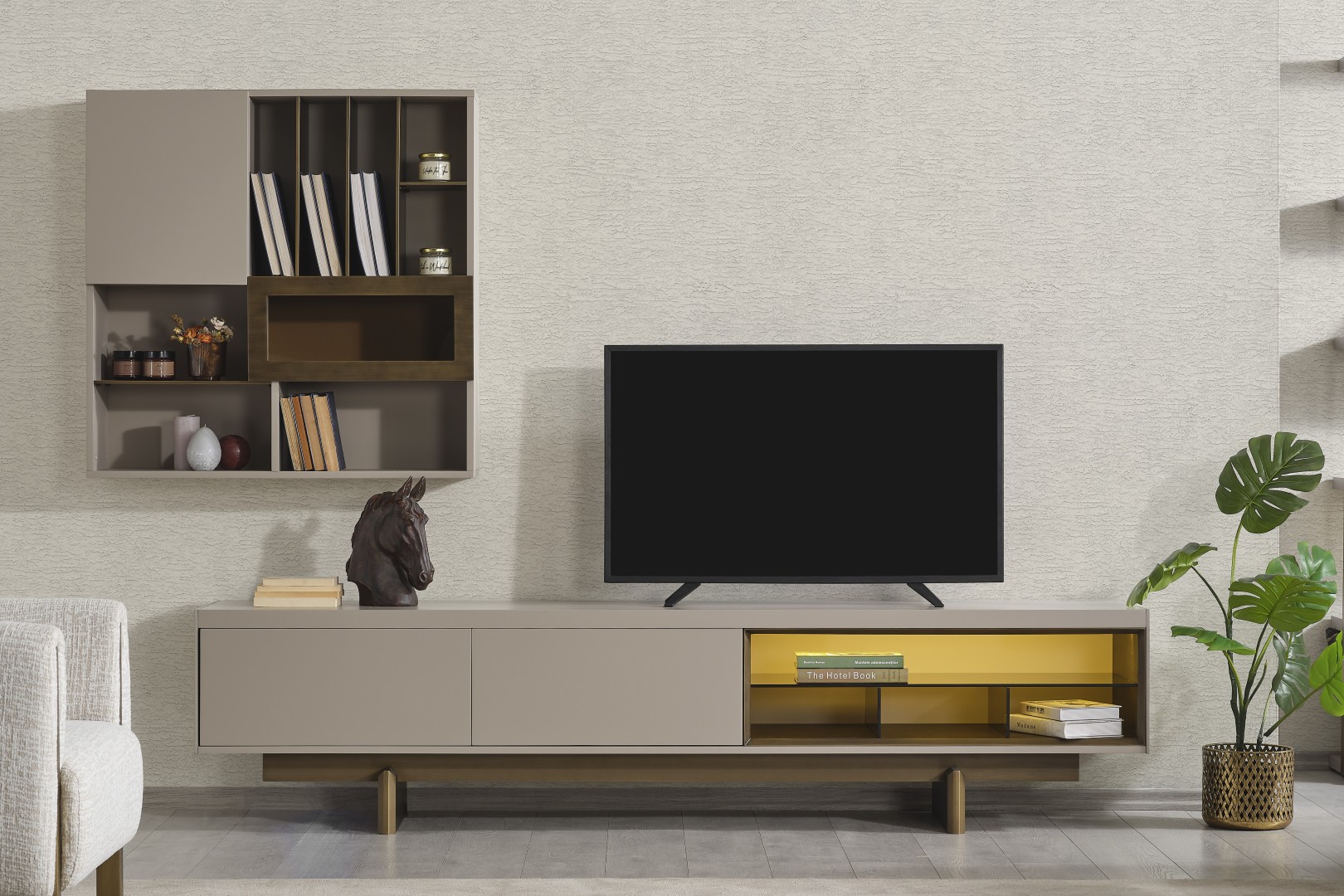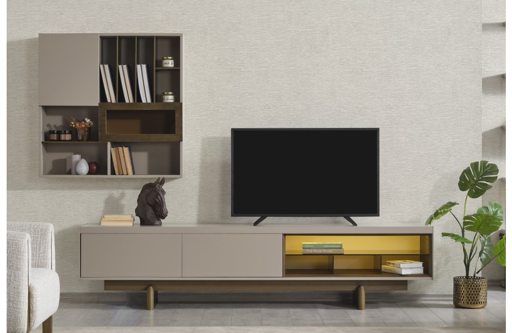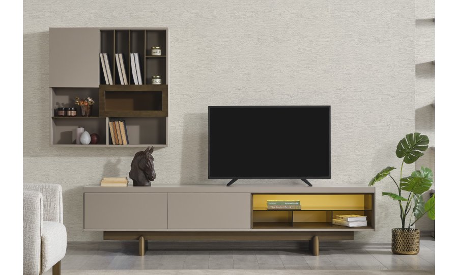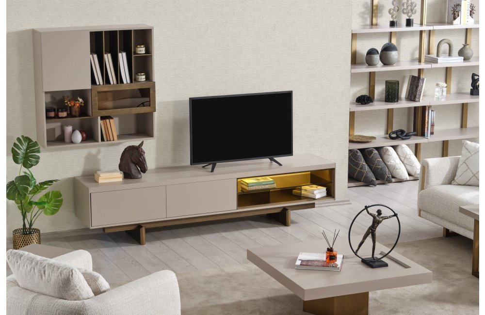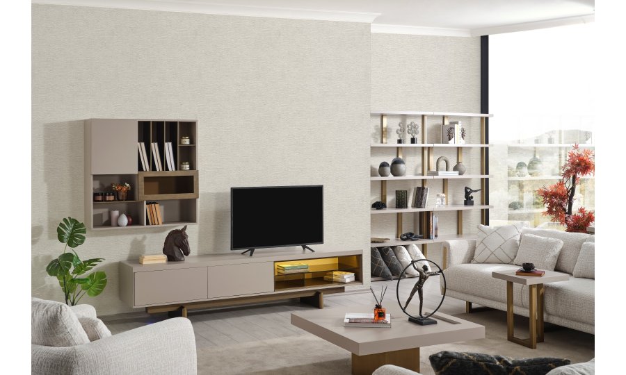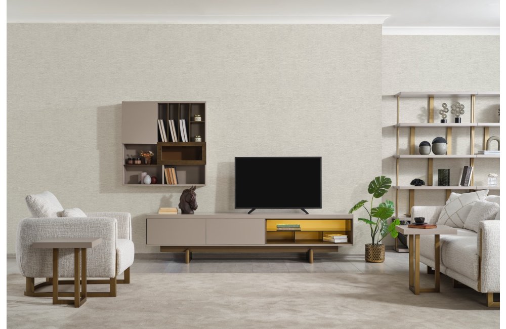 • TV Ünitesi: Kapalı saklama alanları ve açık raflarıyla hem teknolojik cihazlarınızı hem de dekoratif objelerinizi düzenler. Alt modüldeki gold detaylar, salonun genel tasarım diliyle kusursuz bir uyum içindedir.