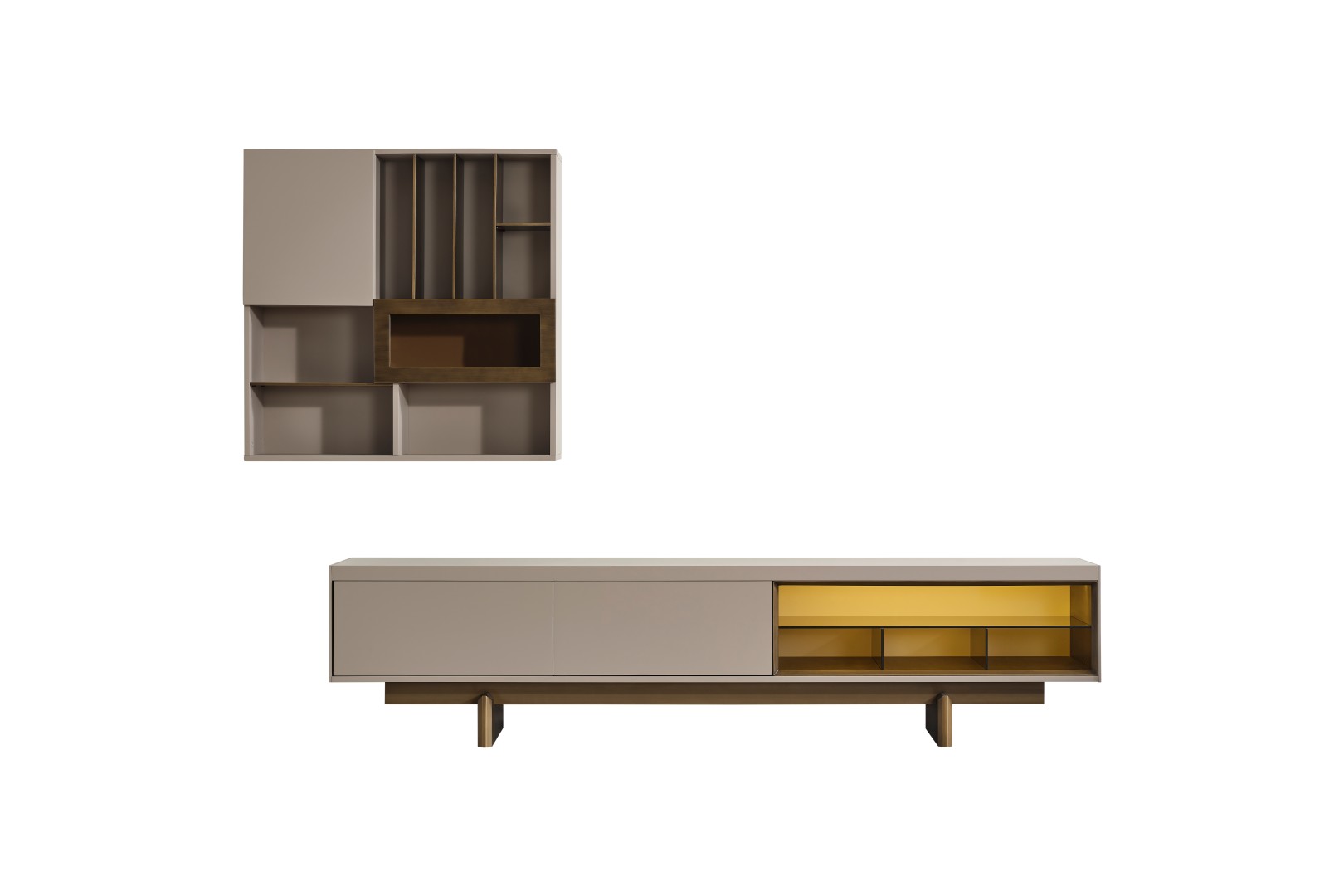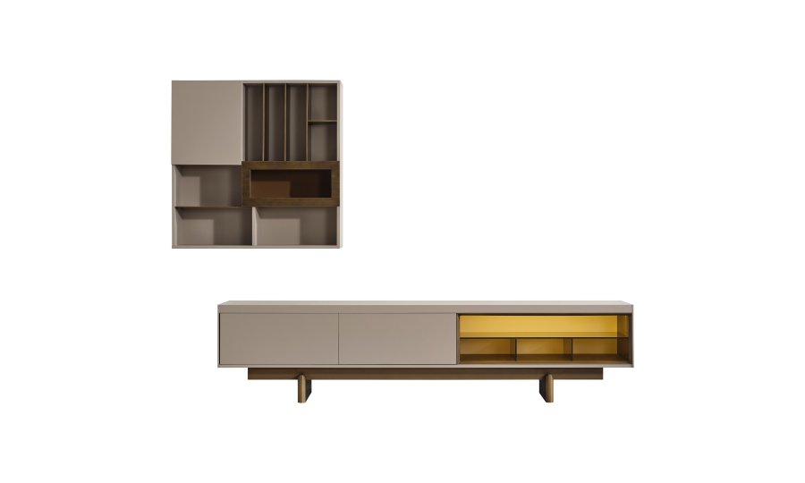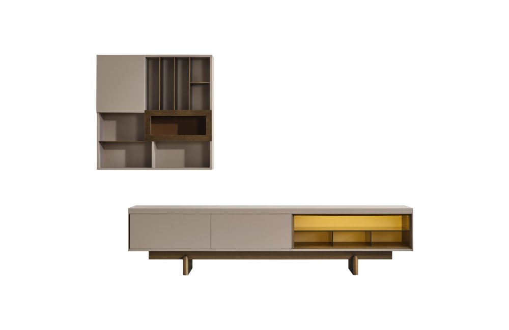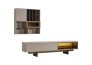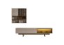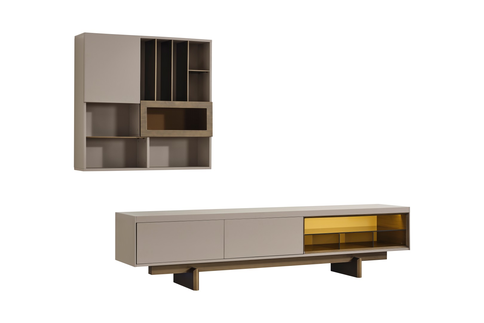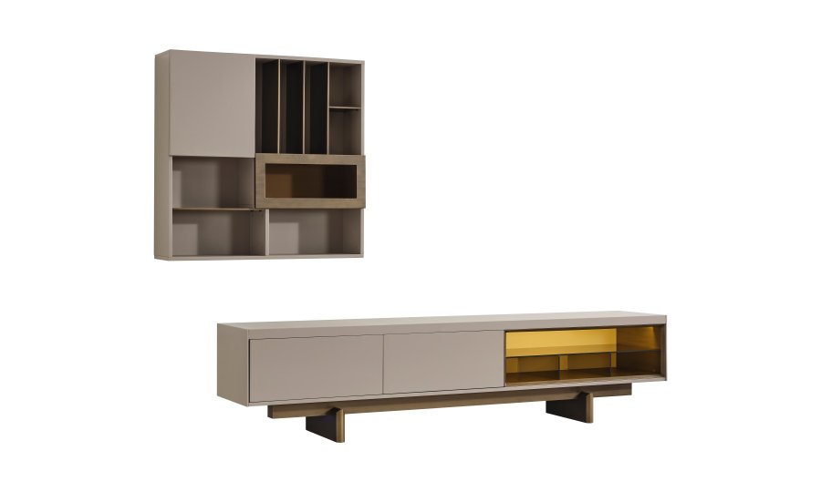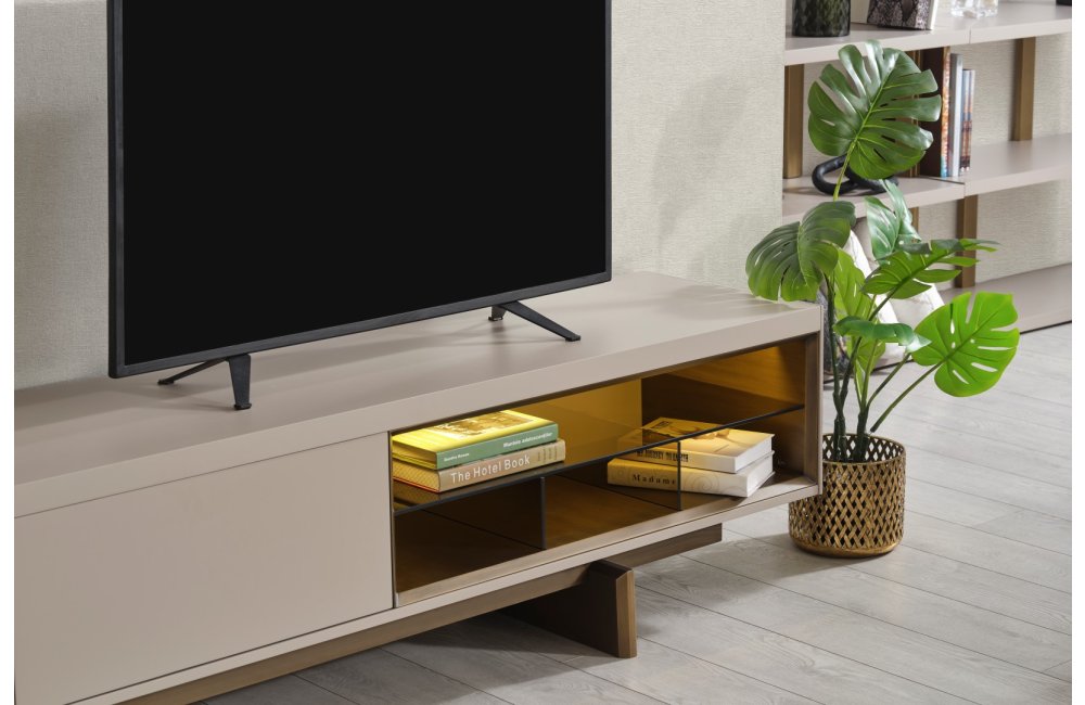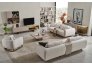 • TV Ünitesi: Kapalı saklama alanları ve açık raflarıyla hem teknolojik cihazlarınızı hem de dekoratif objelerinizi düzenler. Alt modüldeki gold detaylar, salonun genel tasarım diliyle kusursuz bir uyum içindedir.