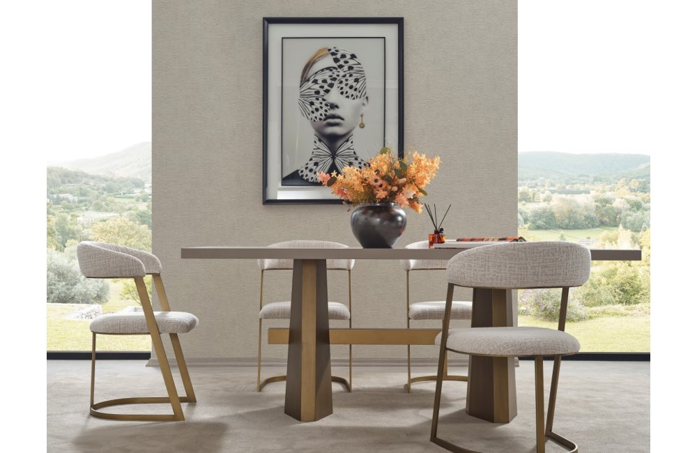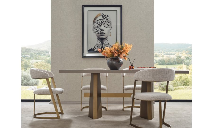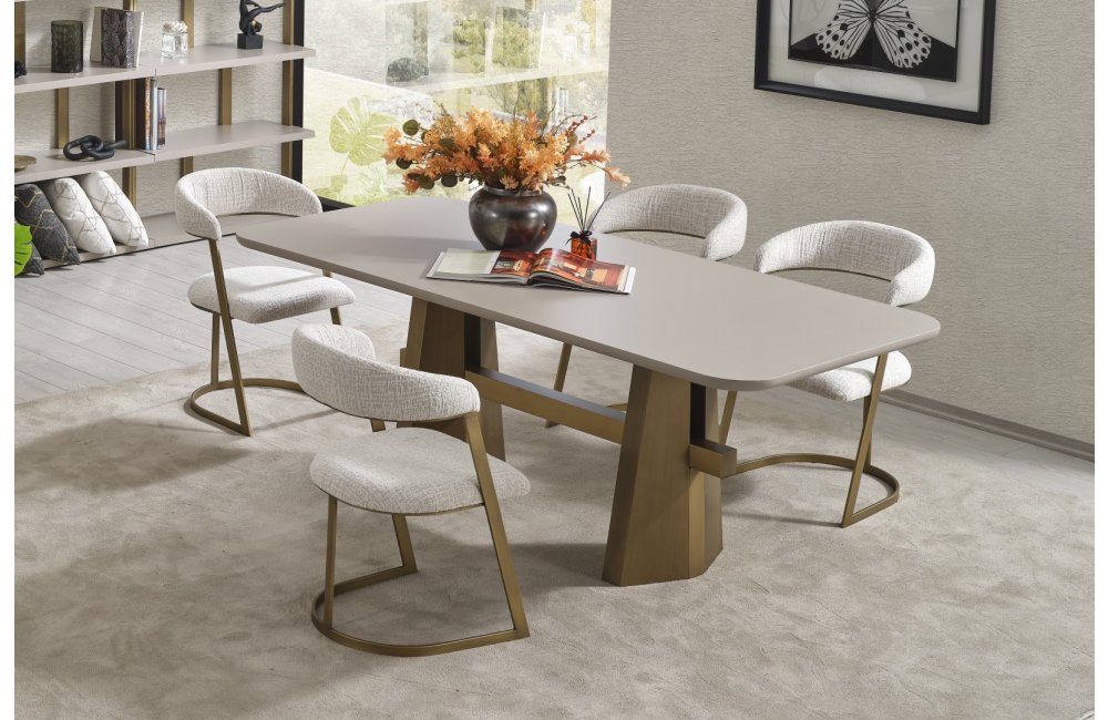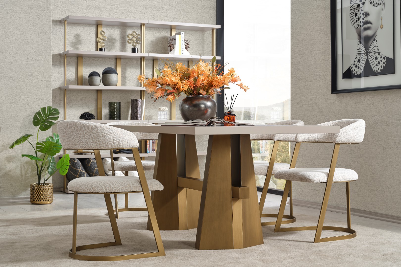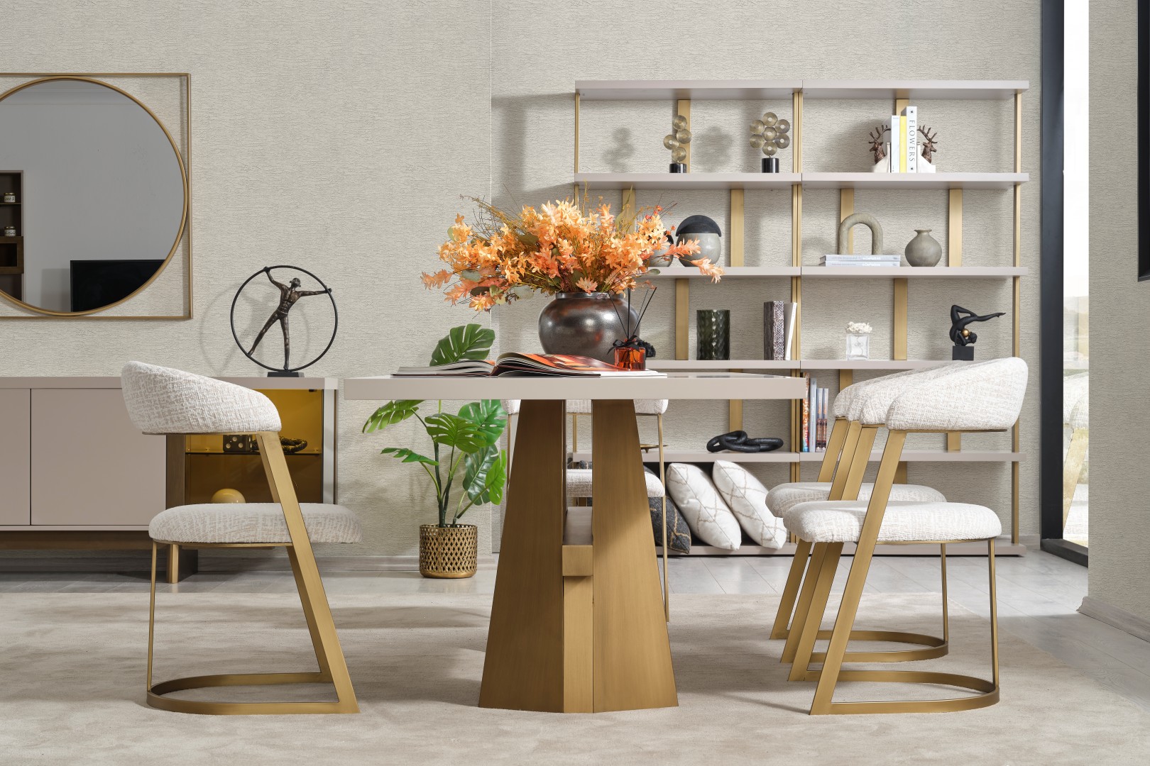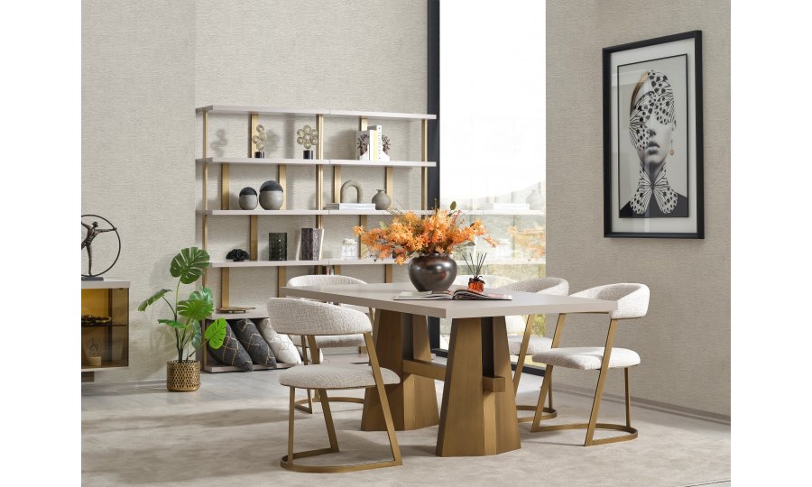 • Yemek Masası: Dikkat çekici vizon tabla, masif ve güçlü bir duruş sergileyen gold ayak yapısıyla birleşiyor.