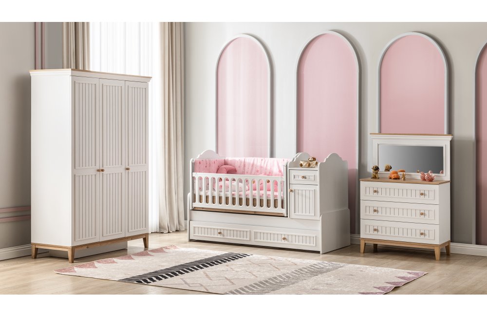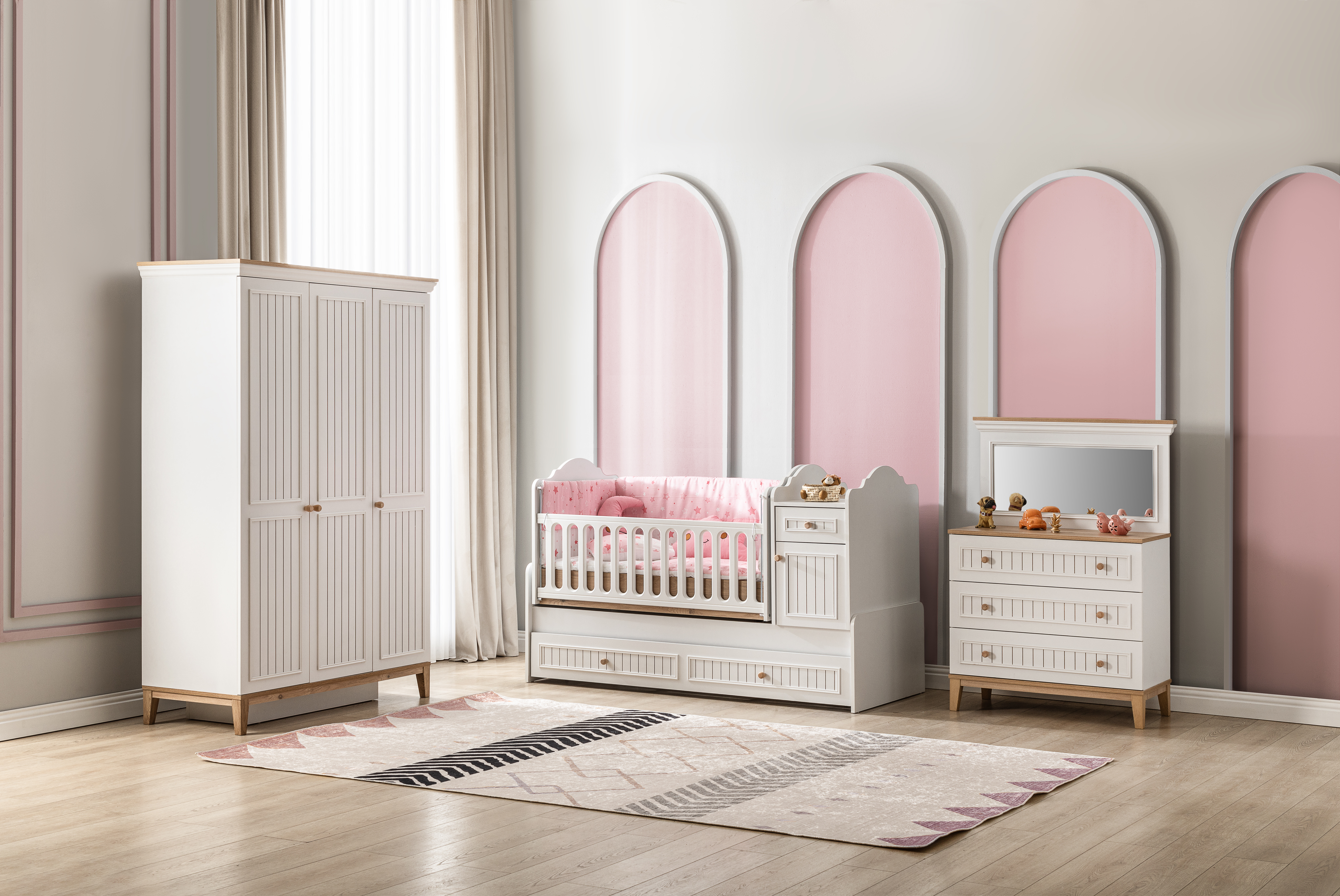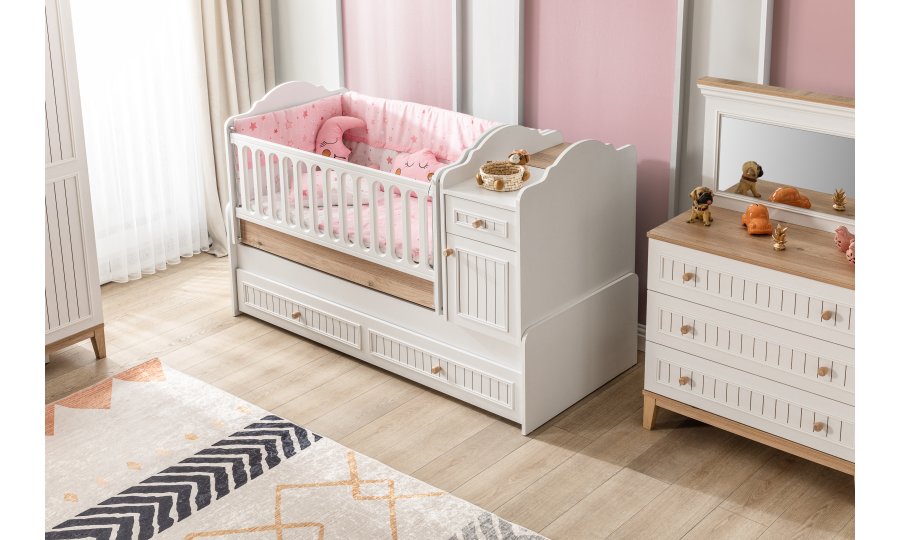 1 adet 60x120 Beşik ,1 adet 2 kapaklı dolap ve 1 adet şifonyerden oluşmaktadır. Uzayan Beşik ,3 Kapaklı dolap,4 Kapaklı Dolap, Komodin,Çalışma Masası ve Kitaplık opsiyonel olarak sunulmaktadır.