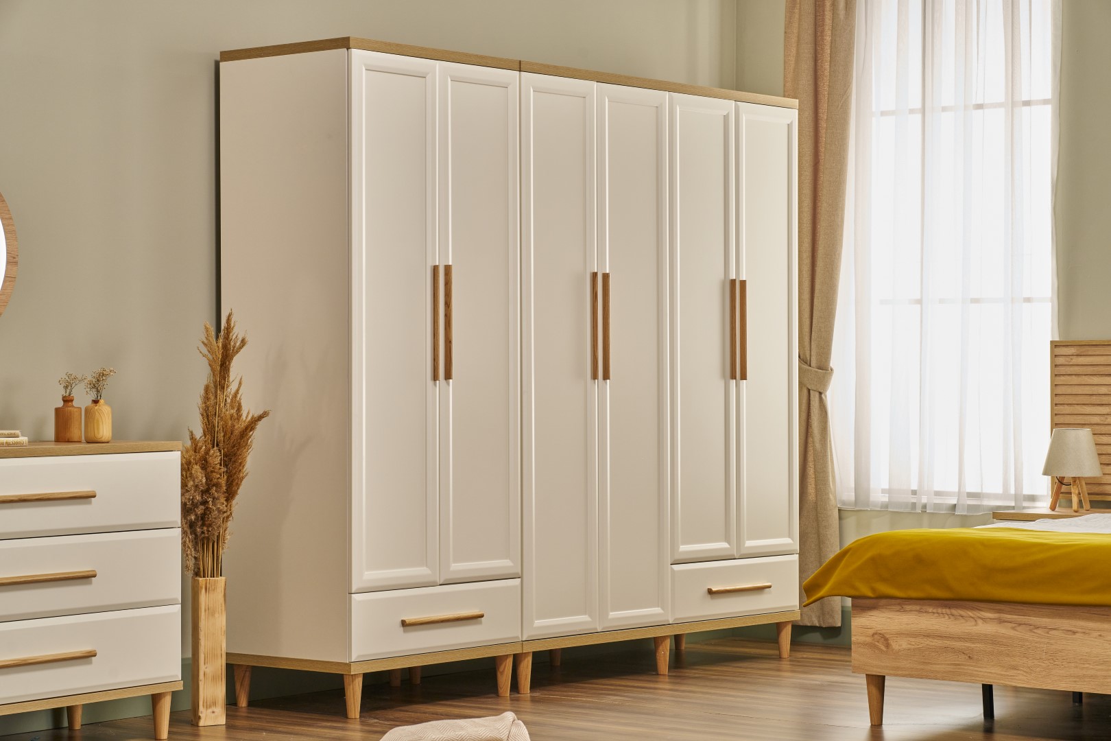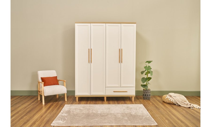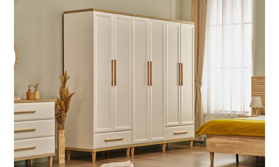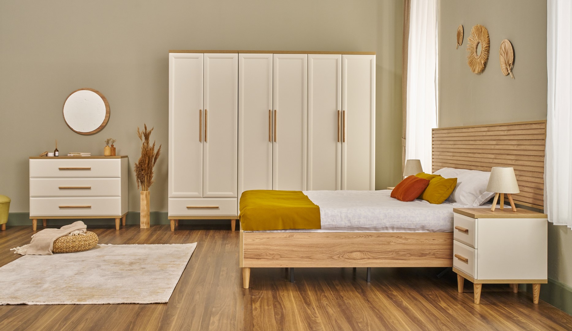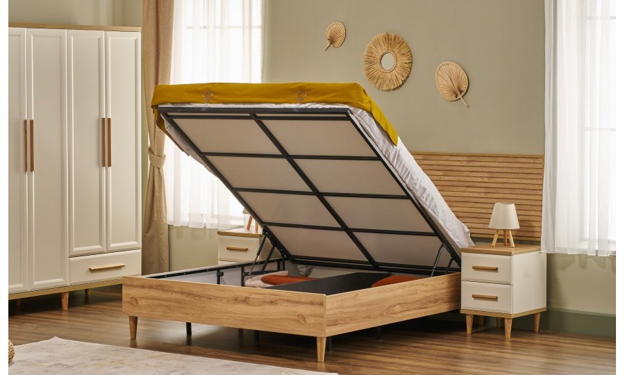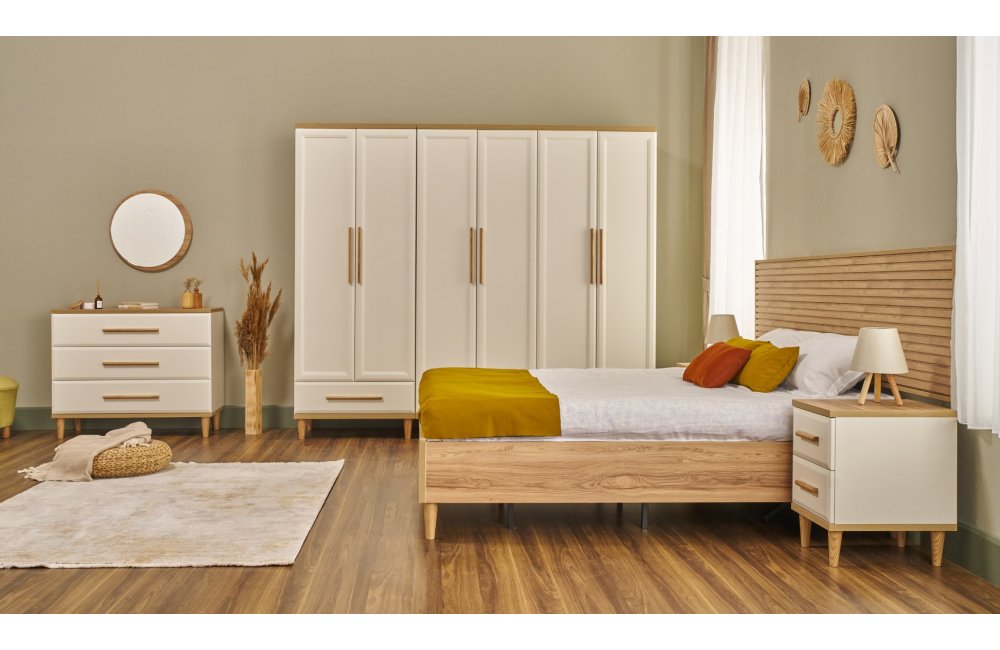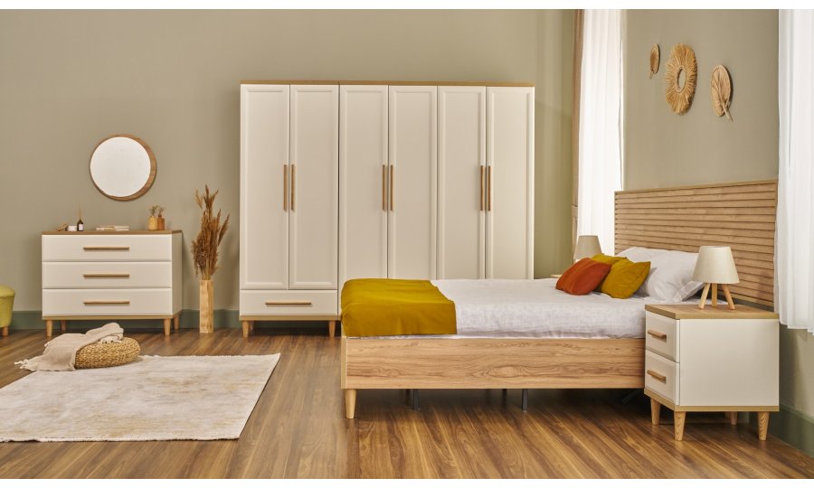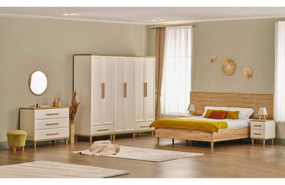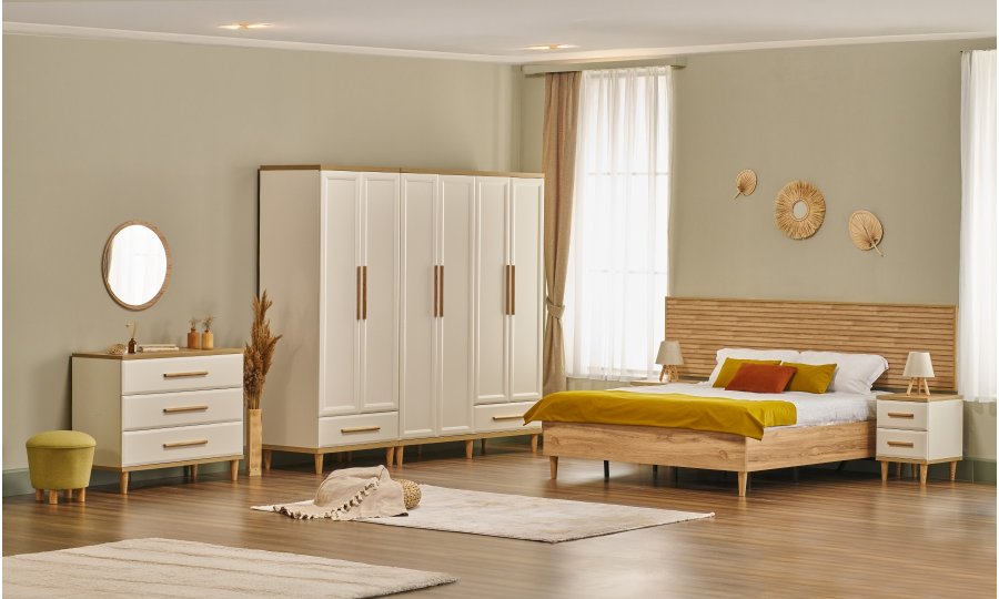 1 adet 160x200 bazalı karyola, 1 adet 4 kapaklı dolap, 1 adet 2 kapaklı dolap, 1 adet şifonyer, 1 adet ayna ve 2 adet komodinden oluşmaktadır.