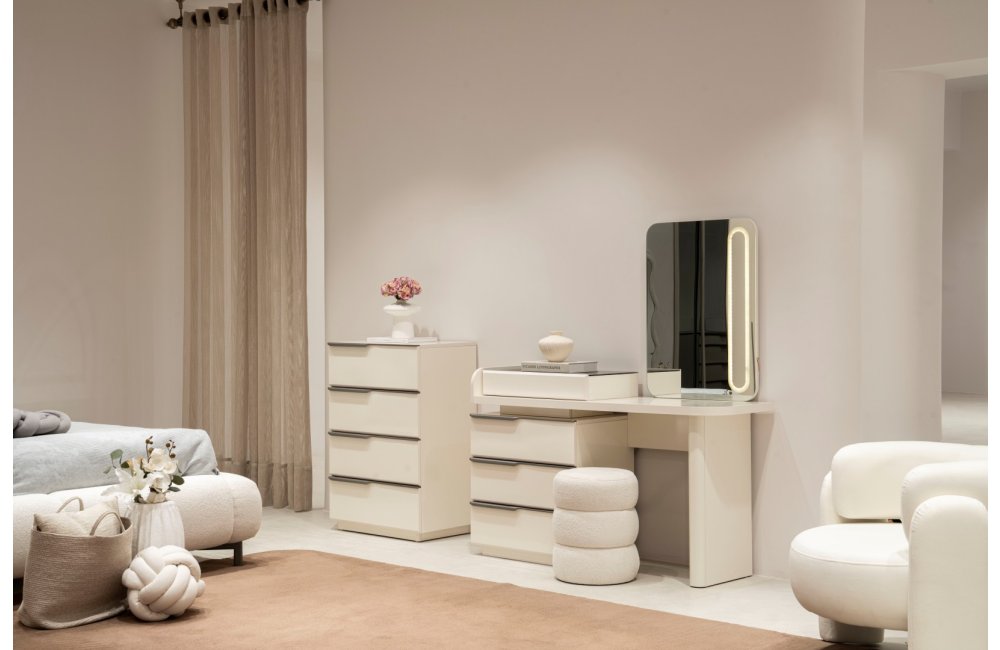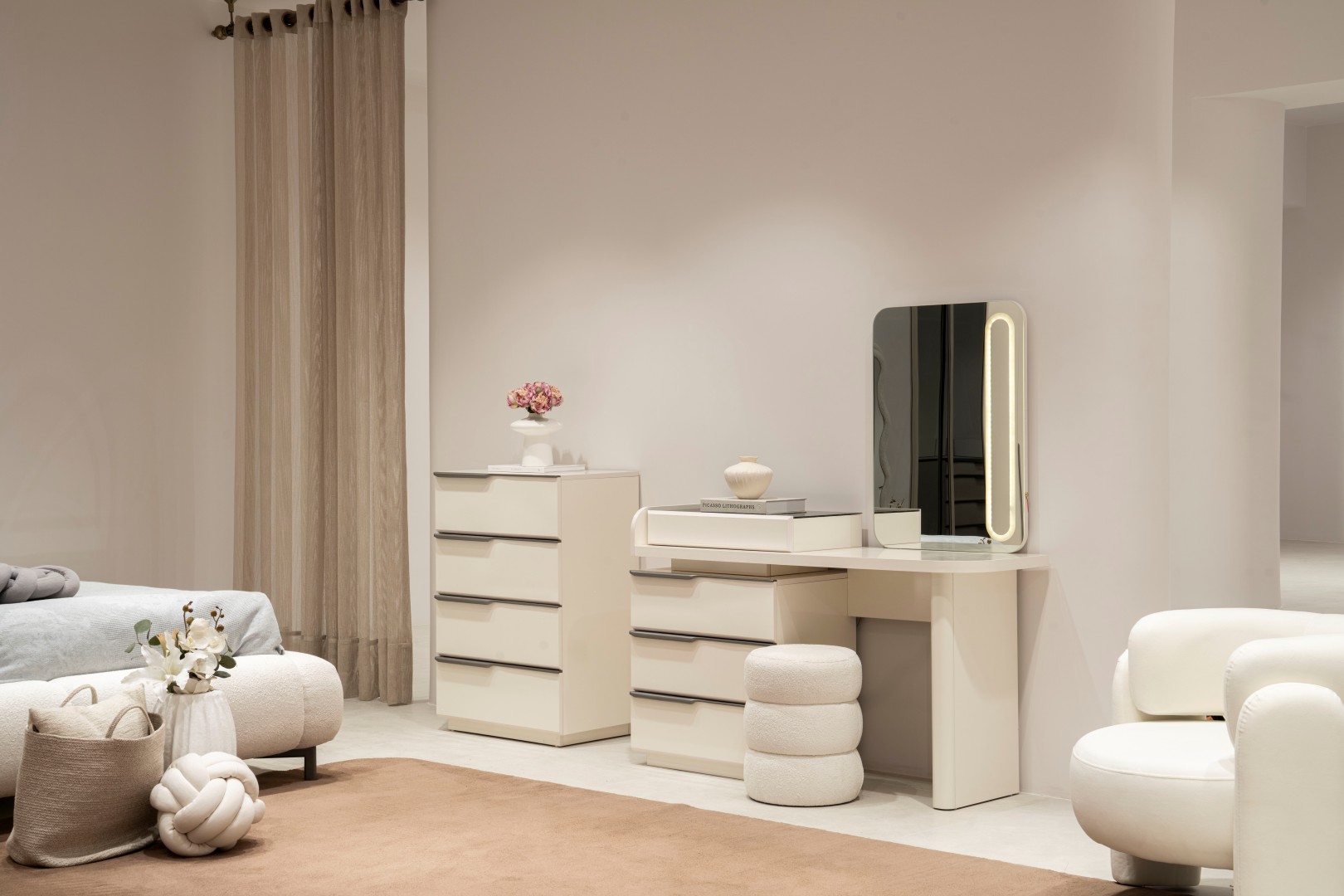 1 ad. tek kapaklı, 2 ad. iki kapaklı çekmeceli, 2 ad. iki kapaklı raflı, 3 ad. iki kapaklı askılıklı, 2 ad. fanus, 1 ad. köşe dolap, 1 ad. bazalı karyola (160x200 cm), 1 ad şifonyer, 1 ad şifonyer aynası ve 2 ad. komodinden oluşmaktadır.