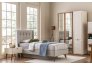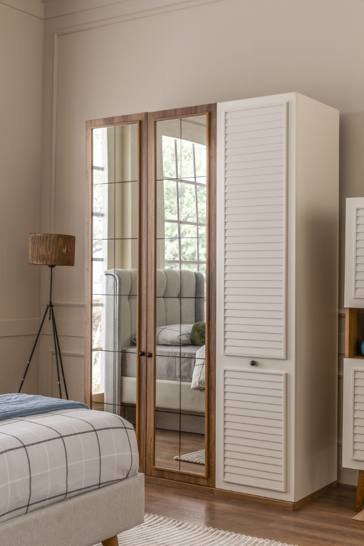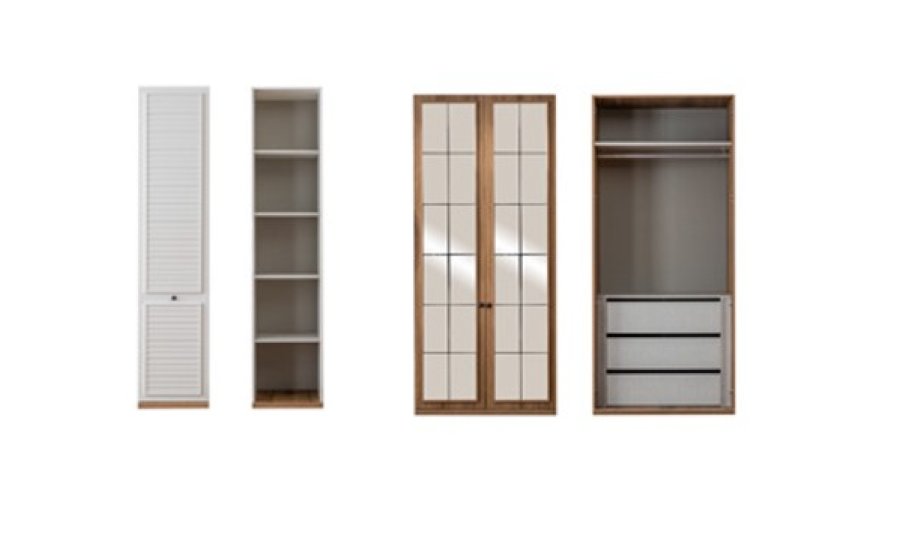1ad. 2 kapaklı dolap, 1ad. tek kapaklı dolap, 1ad. karyola, 1ad. komodinden oluşmaktadır. 3 kapaklı dolap,Çalışma masası alt blok, çalışma masası üst blok, kitaplık, şifonyer ve baza sistemi opsiyonel olarak satılmaktadır.