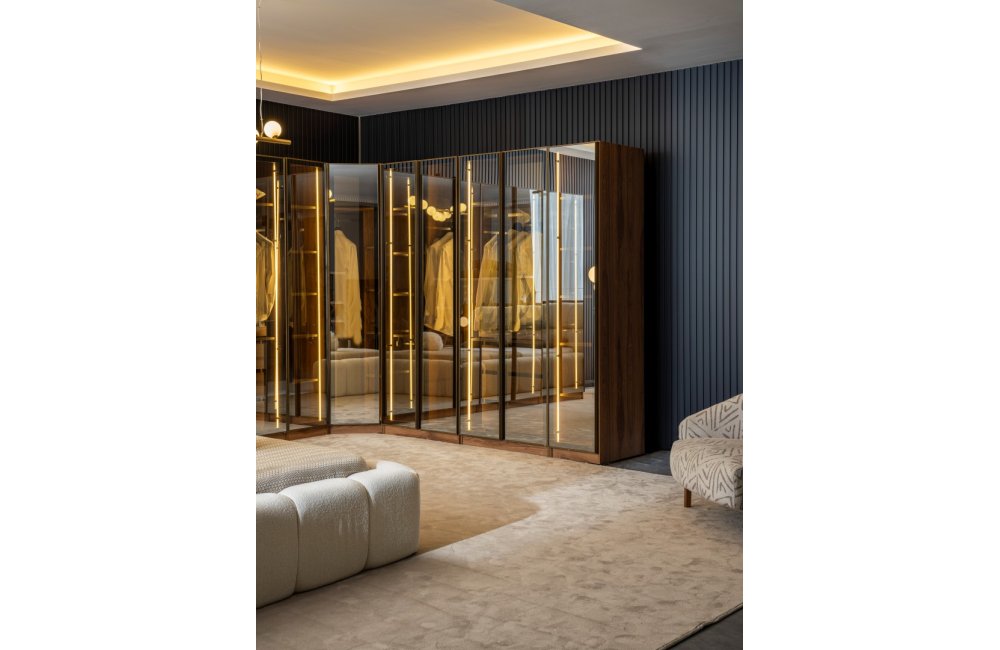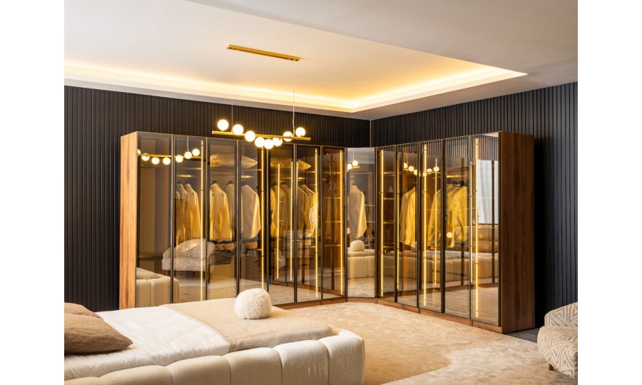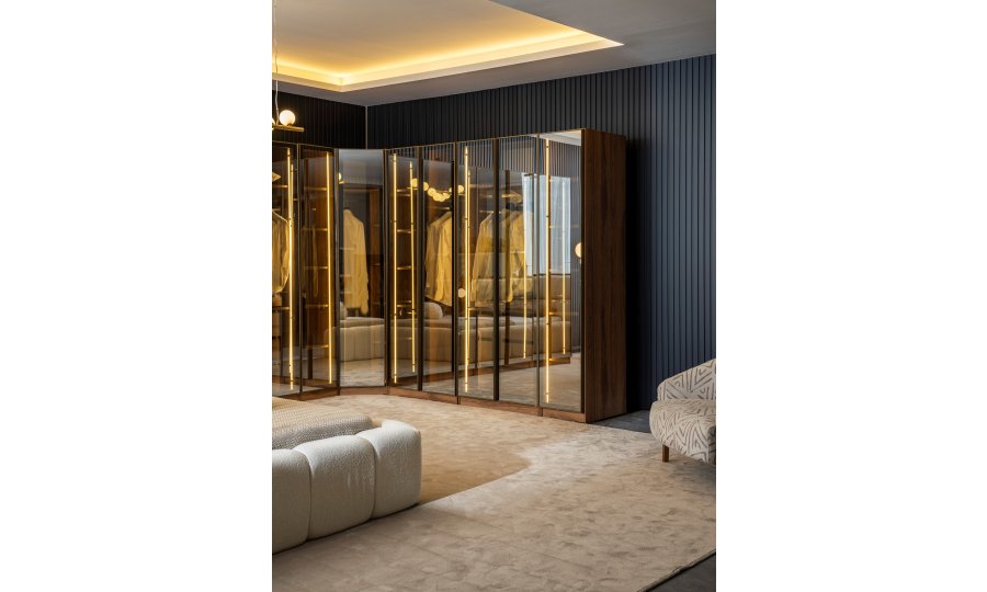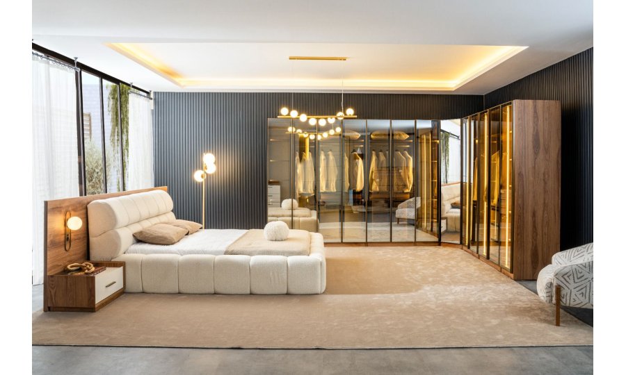1ad. 2kapaklı çekmeceli dolap, 2ad. 2kapaklı pantolonluklu dolap, 1ad.Köşe dolap, 2ad. 2kapaklı raflı dolap, 2ad. tek kapaklı dolap 1ad.şifonyer ve aynası,1ad.bazalı karyola, 2ad.komodin ve 2 ad. komodin panosundan oluşmaktadır. Puf opsiyonel olarak satışa sunulmaktadır.